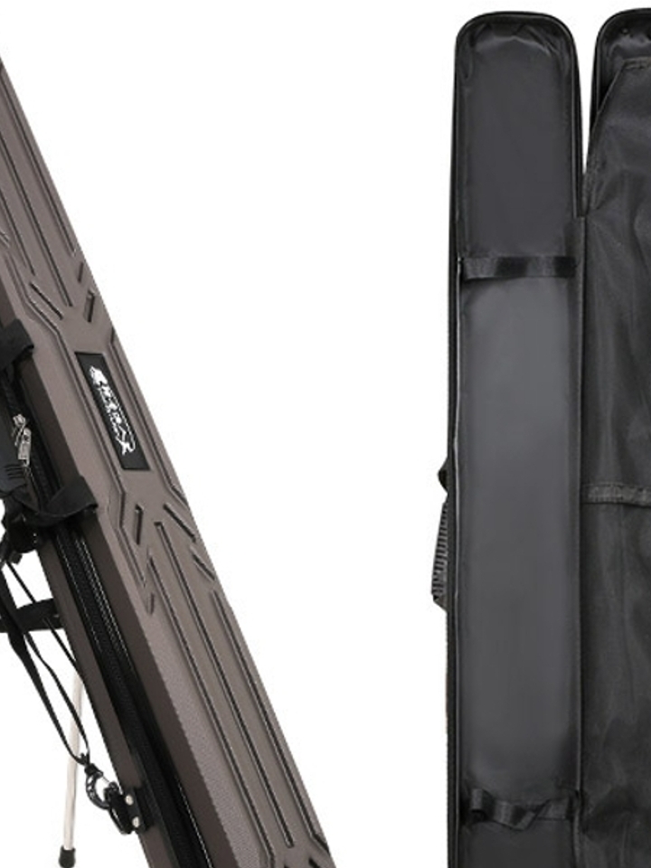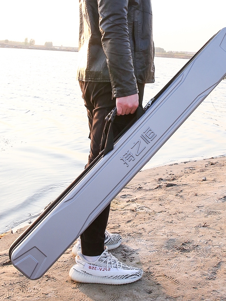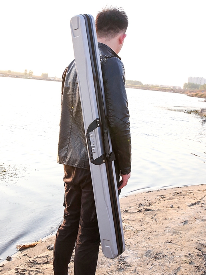 本款鱼竿包采用加厚ABS材料,韧性好,强度高,超轻,容量大,方便使用,配件加厚加固,固定带采用单个固定,外侧可悬挂遮阳伞的扣带设计,非常的人性化!