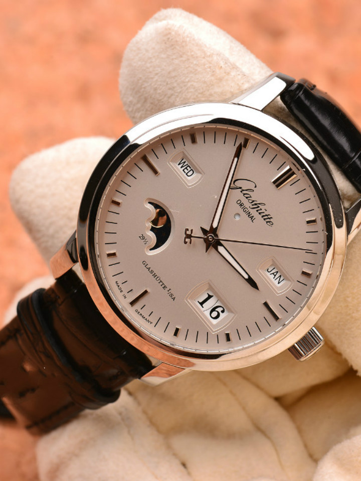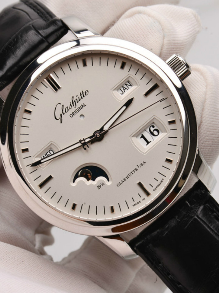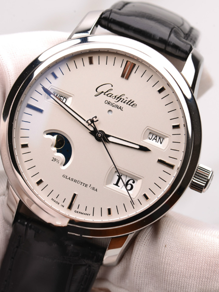 这款格拉苏蒂 参议员系列精钢机械表,腕表选用透底设计,便于观看运转的情况。针扣的表带款式,便于手部的佩戴。腕表结合休闲的风格,展现出男性谙练韵味。