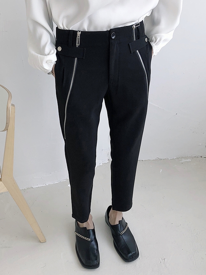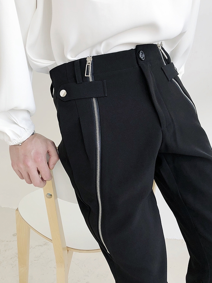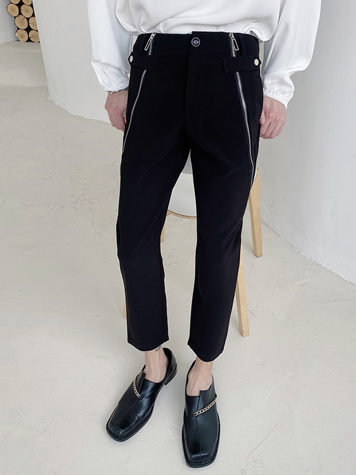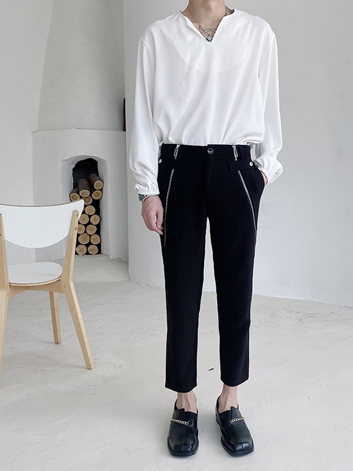 潮味十足的一条九分裤,来自设计师的原创,看点在于后面类似裙摆的设计,通过拉链进行拼接。