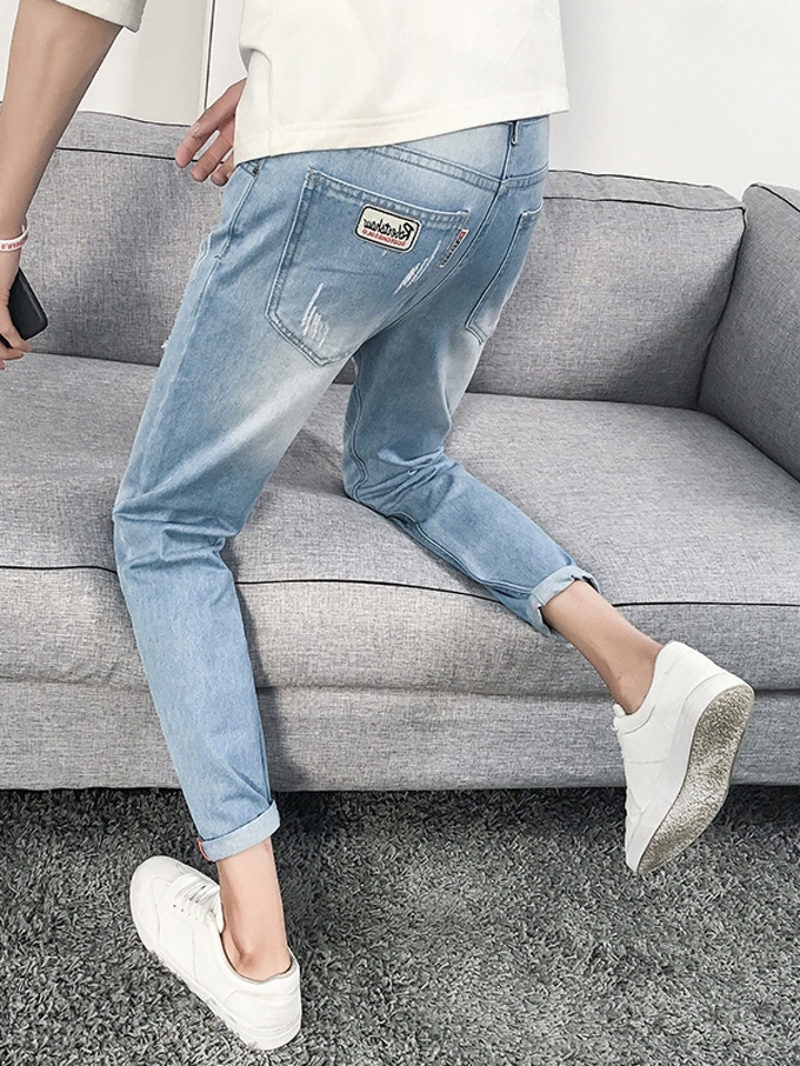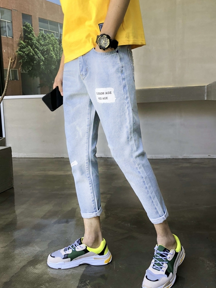 这款青春潮流风的牛仔裤,经典的浅蓝色的牛仔裤,适合夏季休闲穿搭。