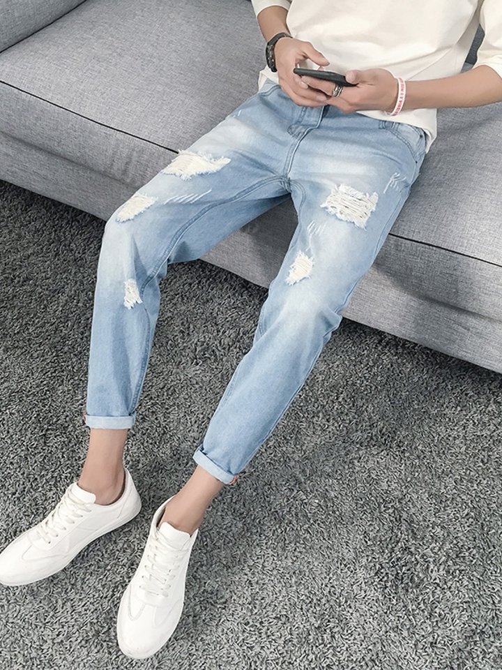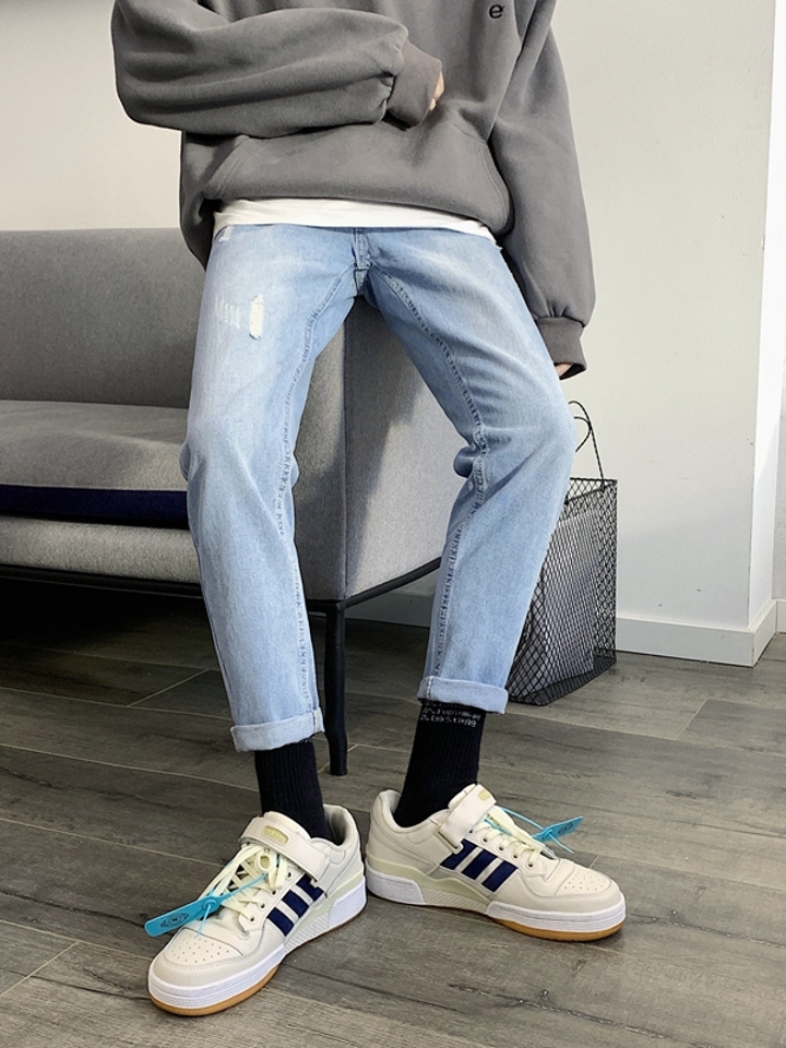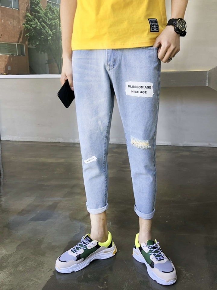 九分裤版型在视觉上有拉长双腿比例的效果,破洞带有潮流设计感,浅蓝色清爽又时尚。