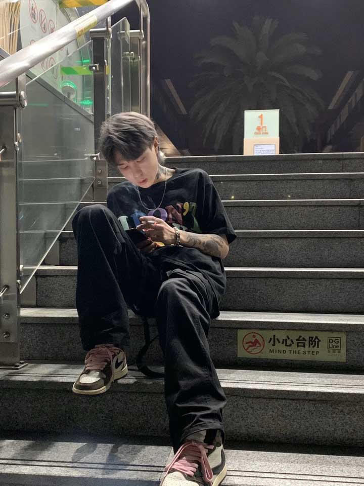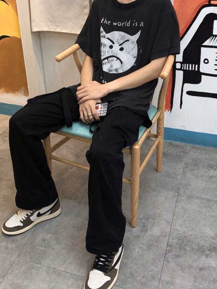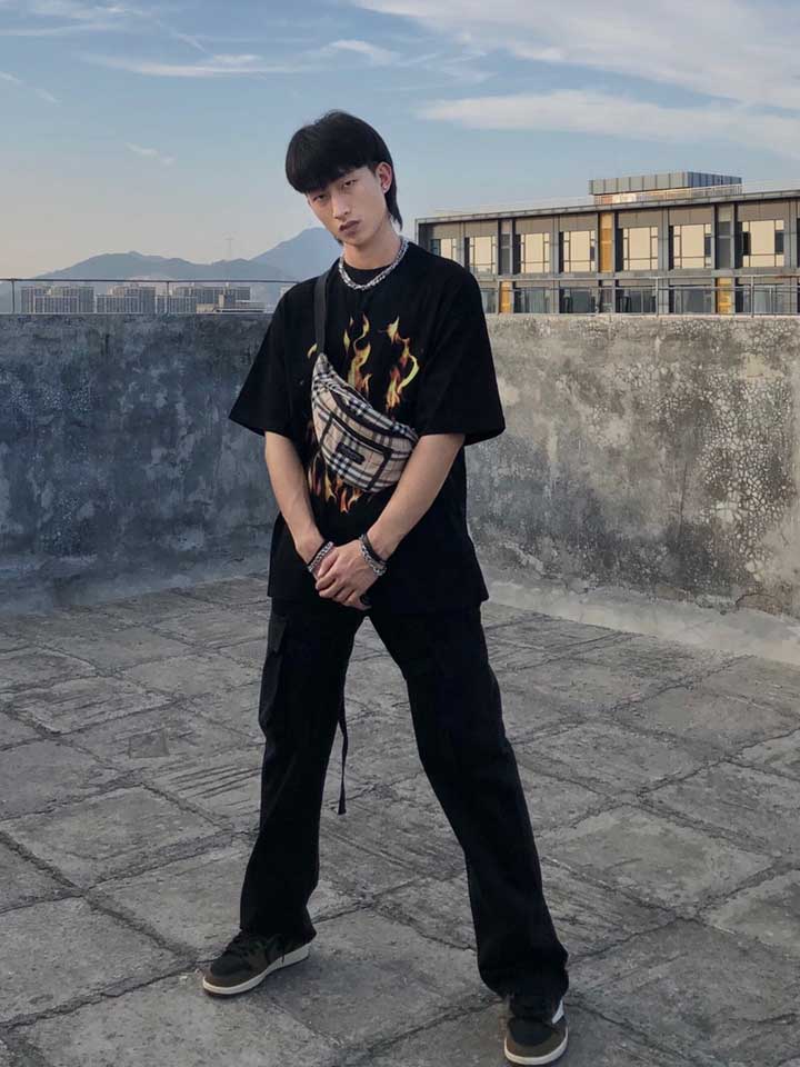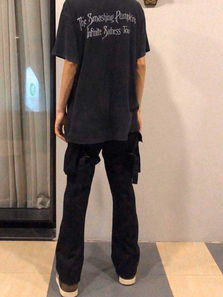 这款裤子上带着几根带子,行走时飘逸十足,十分的张扬。一件搞怪图案的黑色T恤搭配,打破单调与沉闷。尽显俏皮。