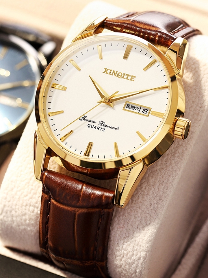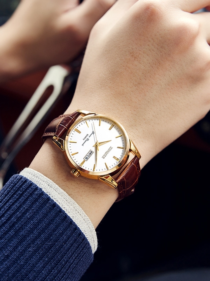 光亮别致的不锈钢的表壳,彰显低调的奢华魅力,搭配进口牛皮,优雅流畅的线条,简约优雅中缔造欧式绅士风。经典大方,给你不一样的视觉体验。表带优选进口小牛皮,柔韧耐磨,耐折耐腐;独特的夜光功能,环保无毒无辐射;