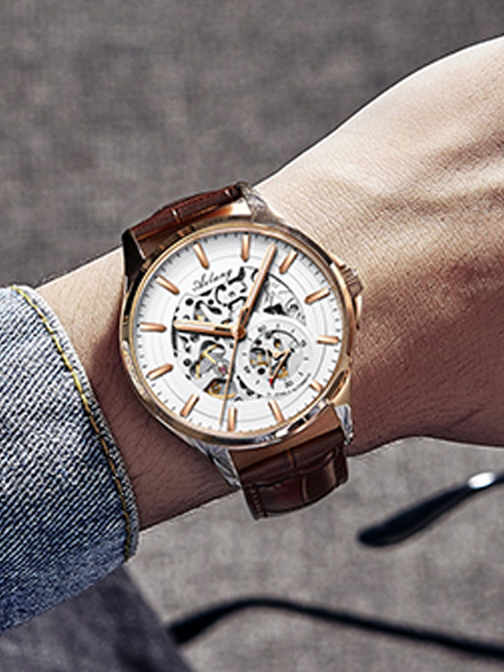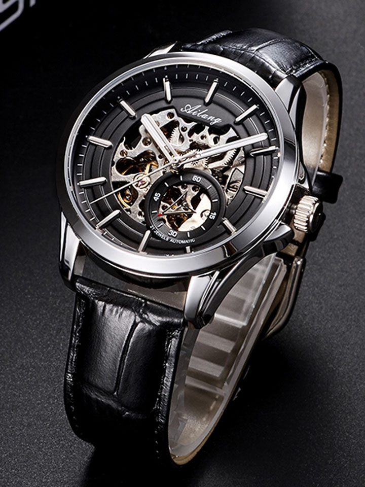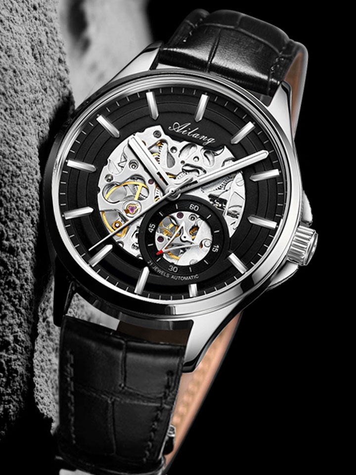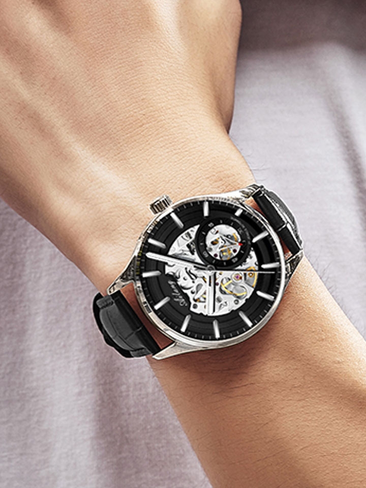 采用酷炫黑个性表盘,显现代摩登范,机械机芯,性能稳定;精致的透视机芯设计,结合了活力十足的银色的三指针,带来视觉盛享。