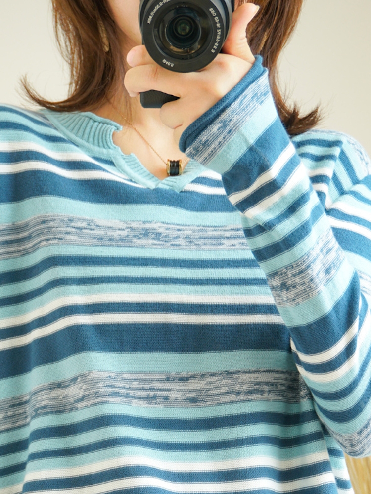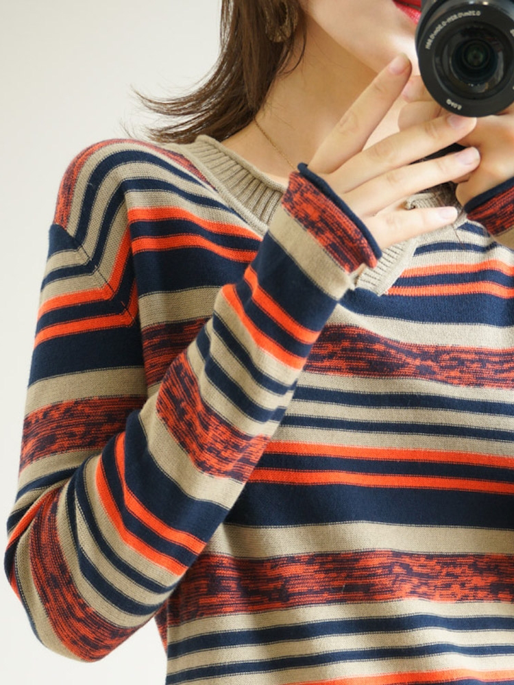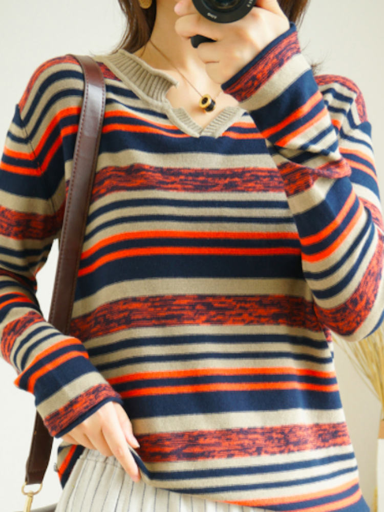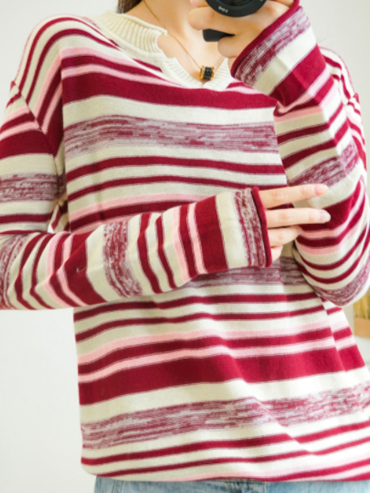 螺纹样式的v领设计,美观大方又不失别致感。多色宽窄条纹的混合,让版面美观雅致也能时尚不单调。