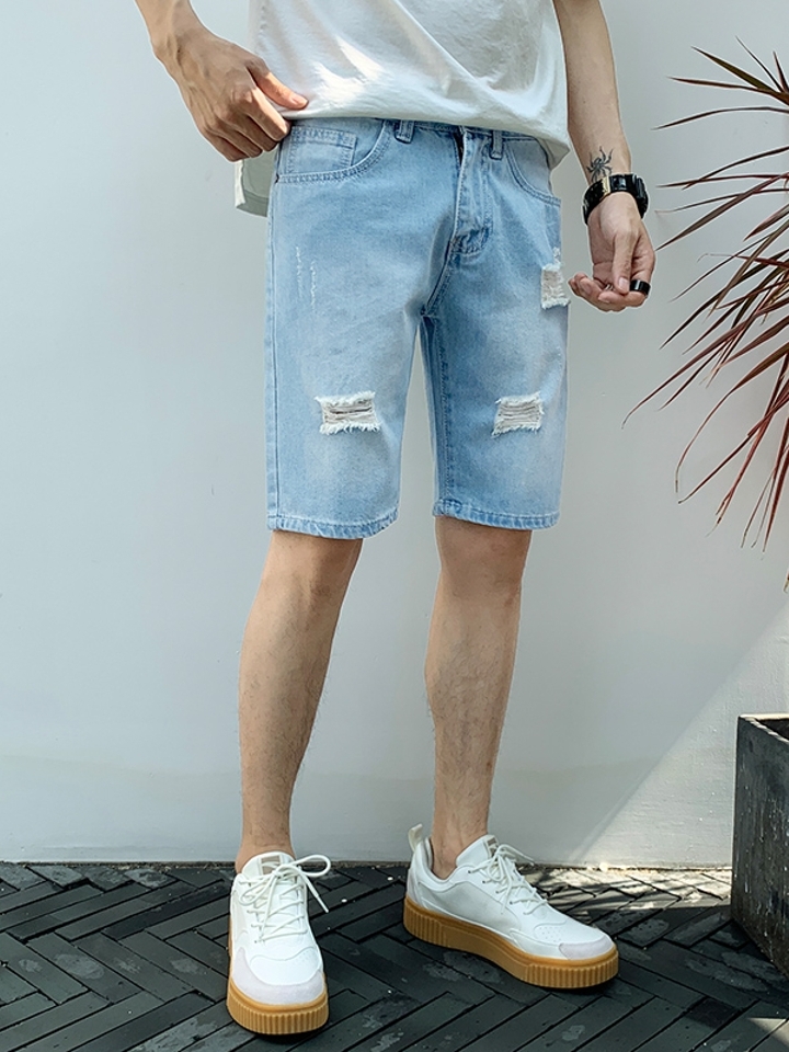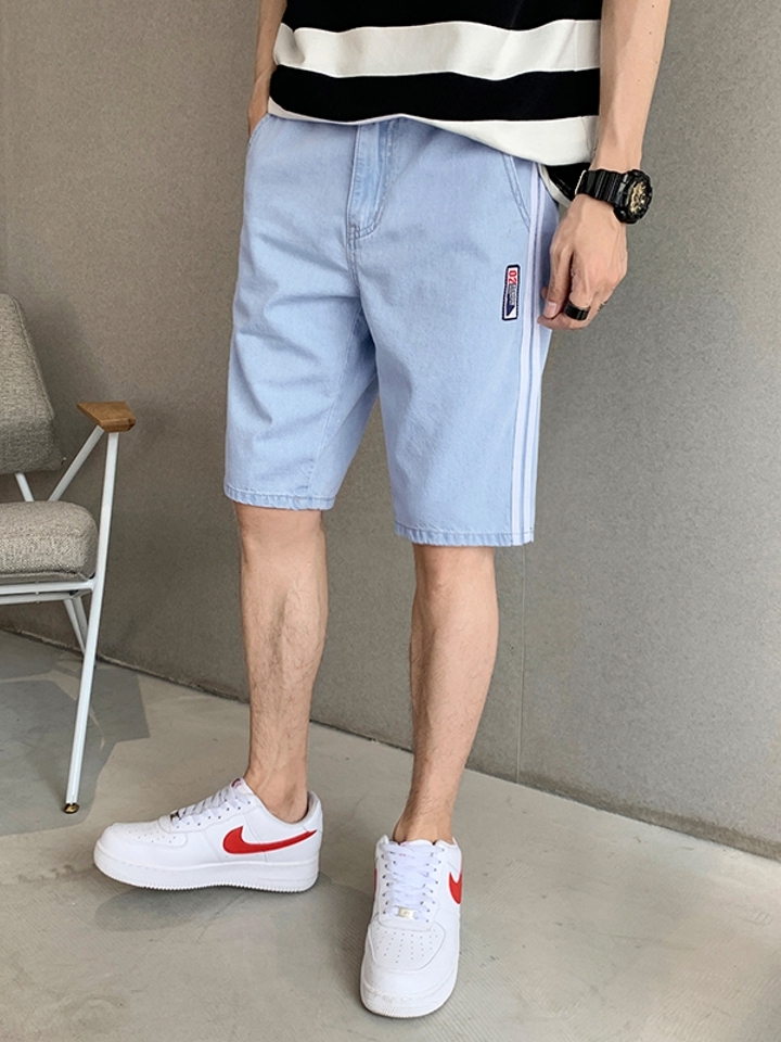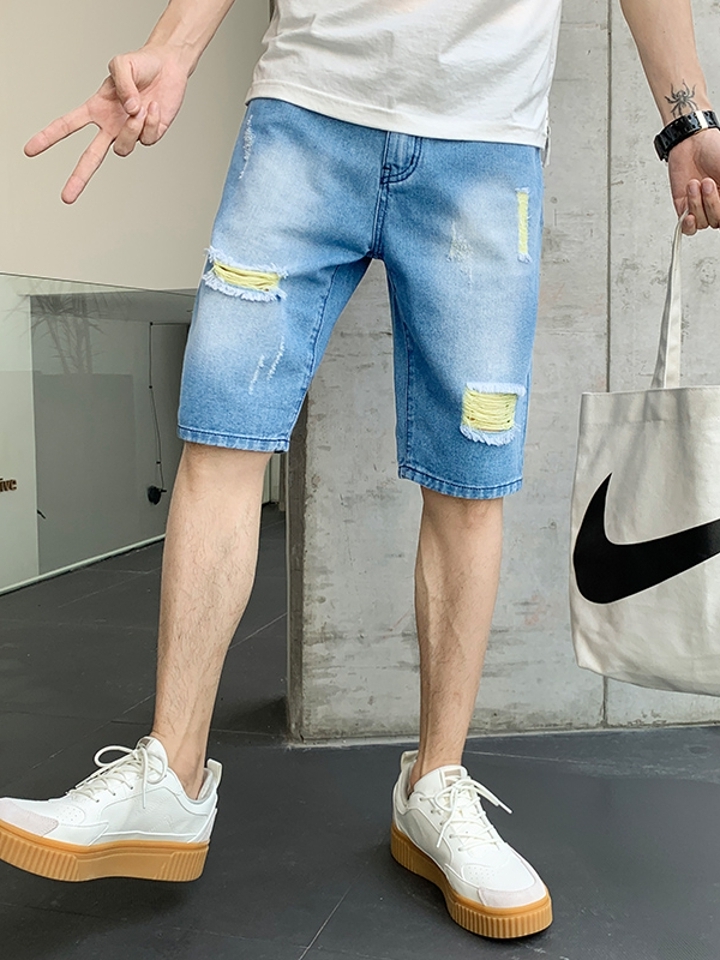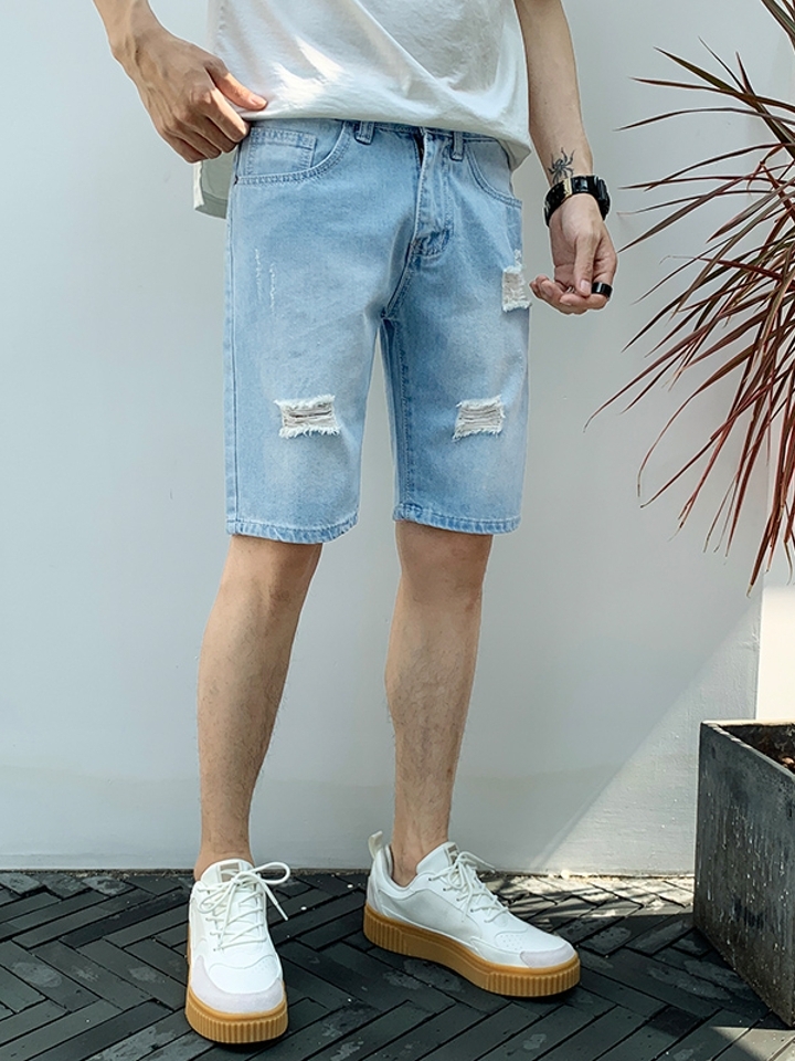 修身的牛仔短裤,经过水洗做旧的处理,表面的颜色显现的越发自然。