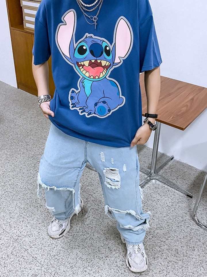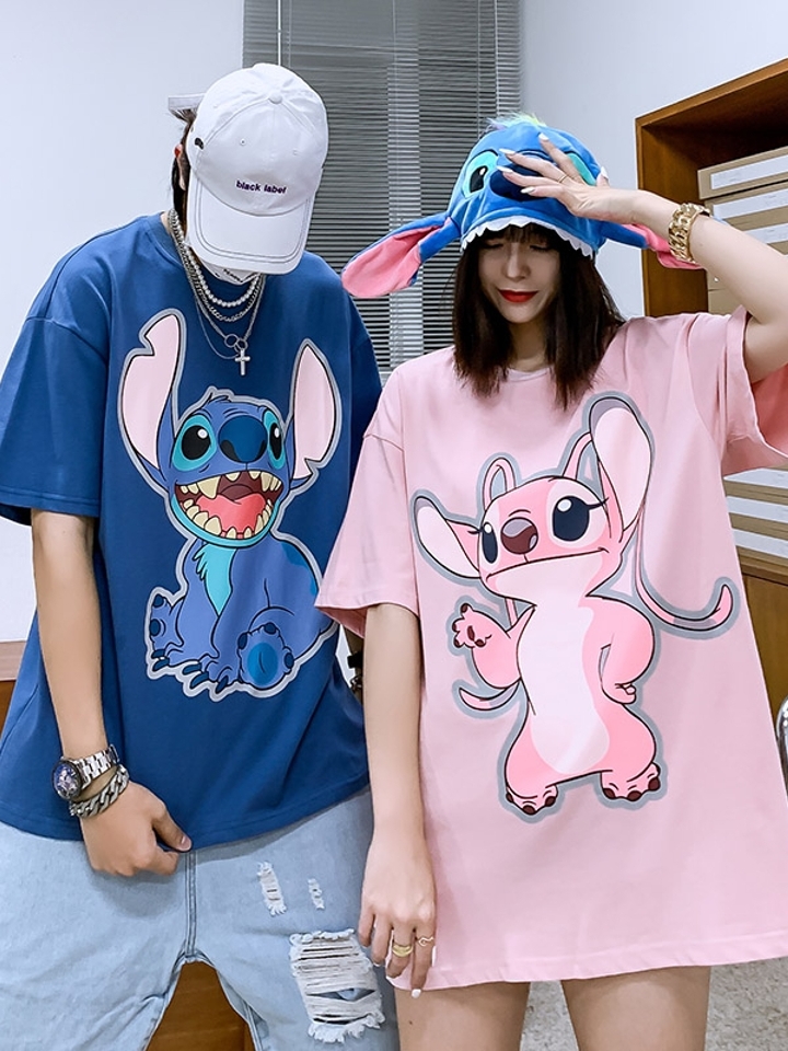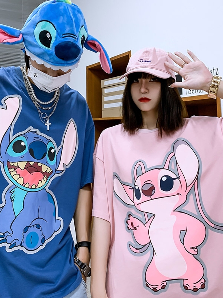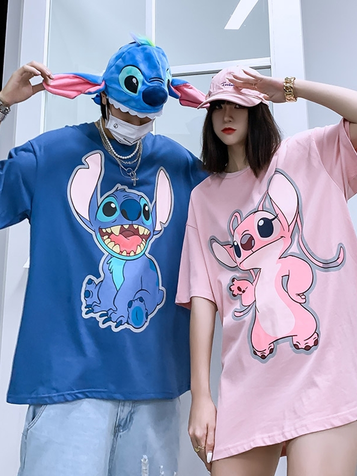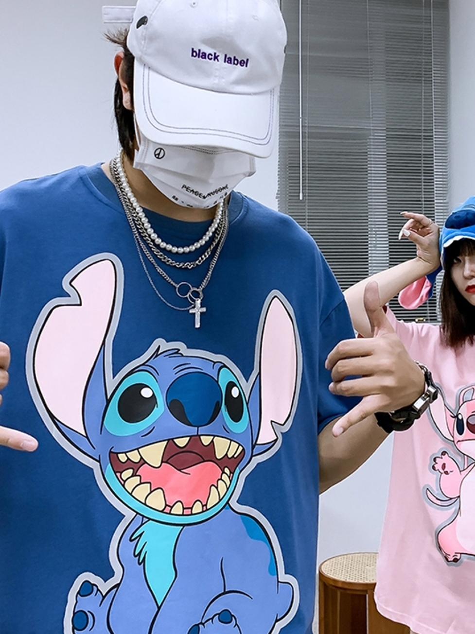 设计师做了蓝色和粉色,很减龄。值得一提的是,设计师在胸前加入了史迪仔印花点缀,既打破了纯色的单一,也增添了穿搭趣味性。