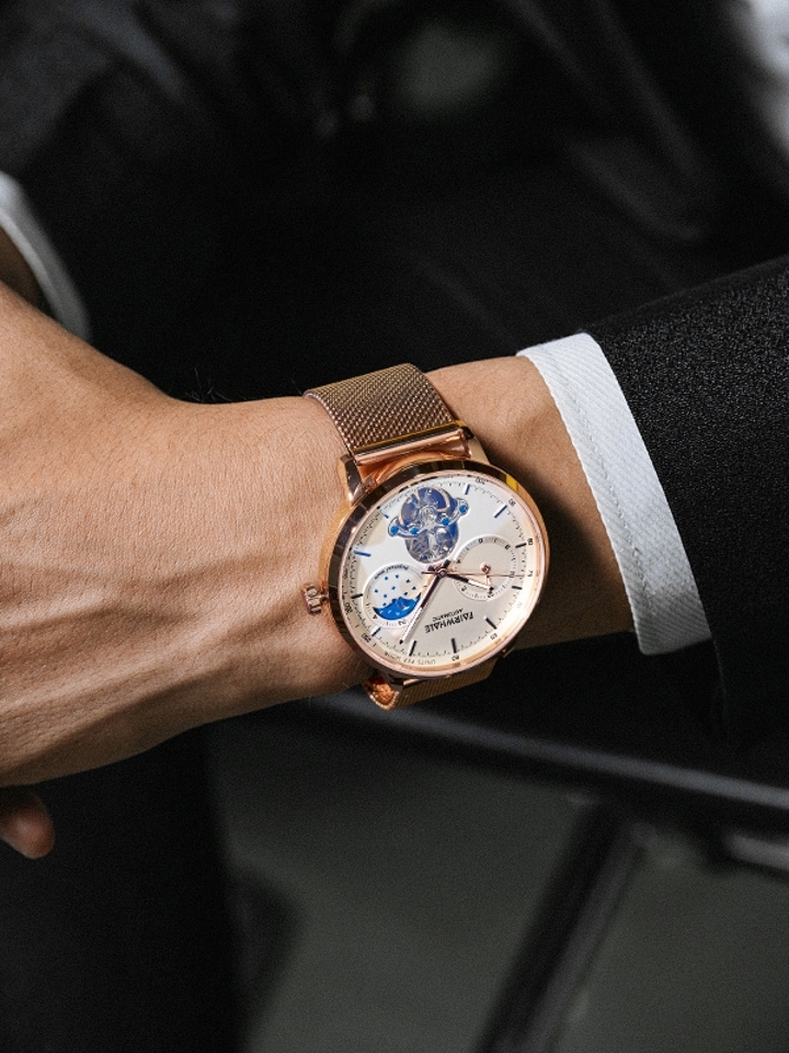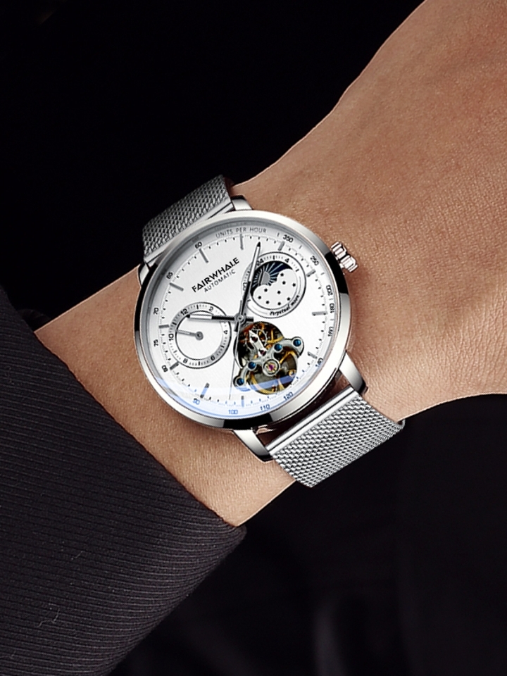 这款机械表采用优良316L精钢材质,低敏耐磨,弧形表壳修饰手表美观度。双按蝴蝶扣做工精细,方便佩戴。精钢表带质感层次鲜明,独添几分自信与从容。