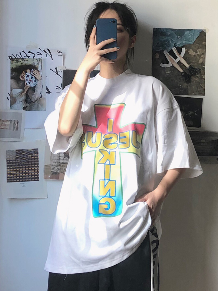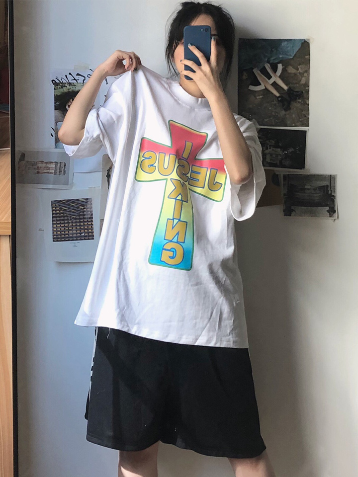 这款t恤是简约的风格,宽松的版型,时尚百搭,胸前的字母印花,很有个性,搭配牛仔裤或者短裤都很好看。