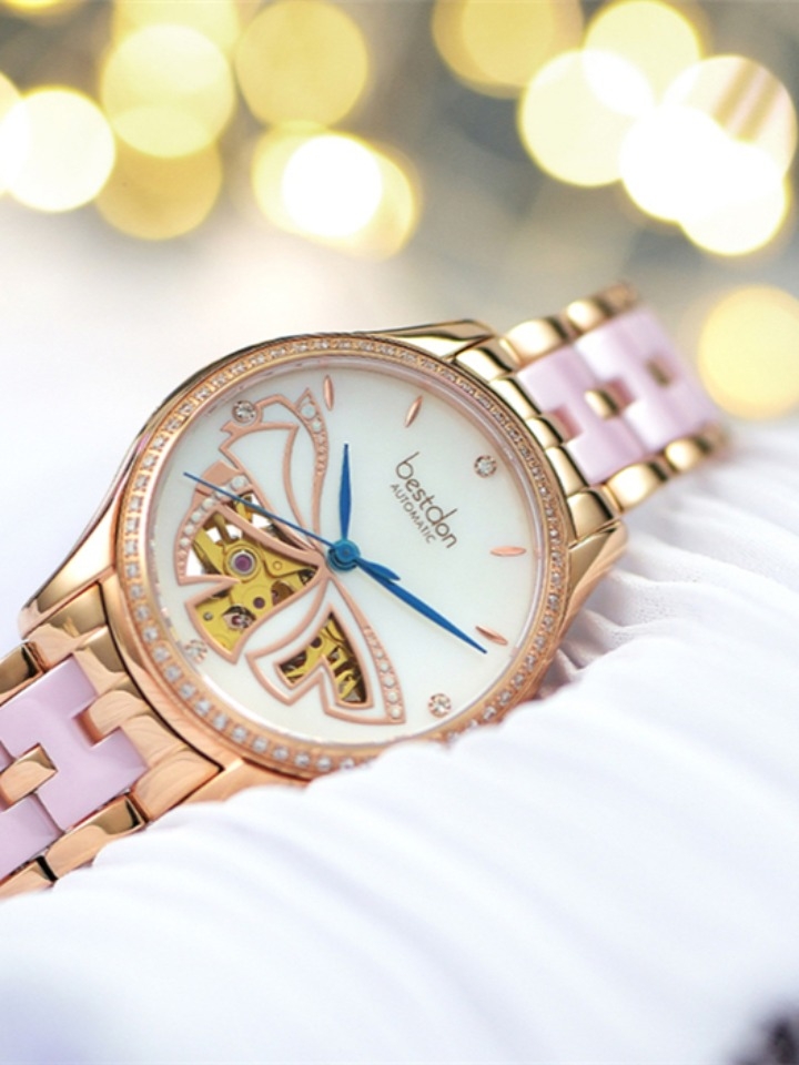 蝴蝶形镂空花纹,搭配清新贝壳底。时位镶钻设计,可拆卸式陶瓷表带。