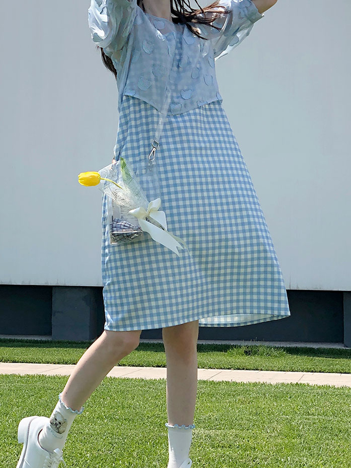 商店创作的这款半身裙和上衣防晒外套的套装,巧妙的运用蓝色的格纹的元素,很好的展现出中国风之美。
