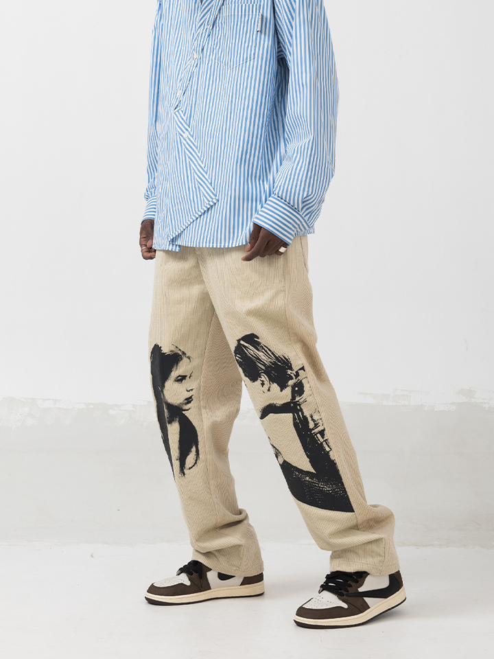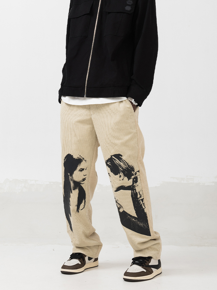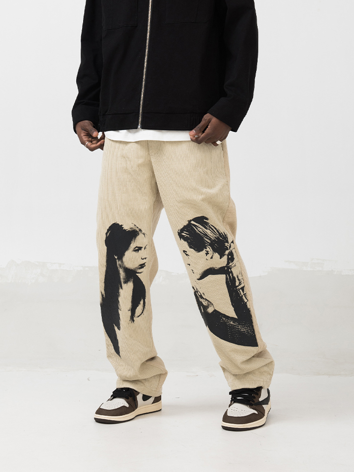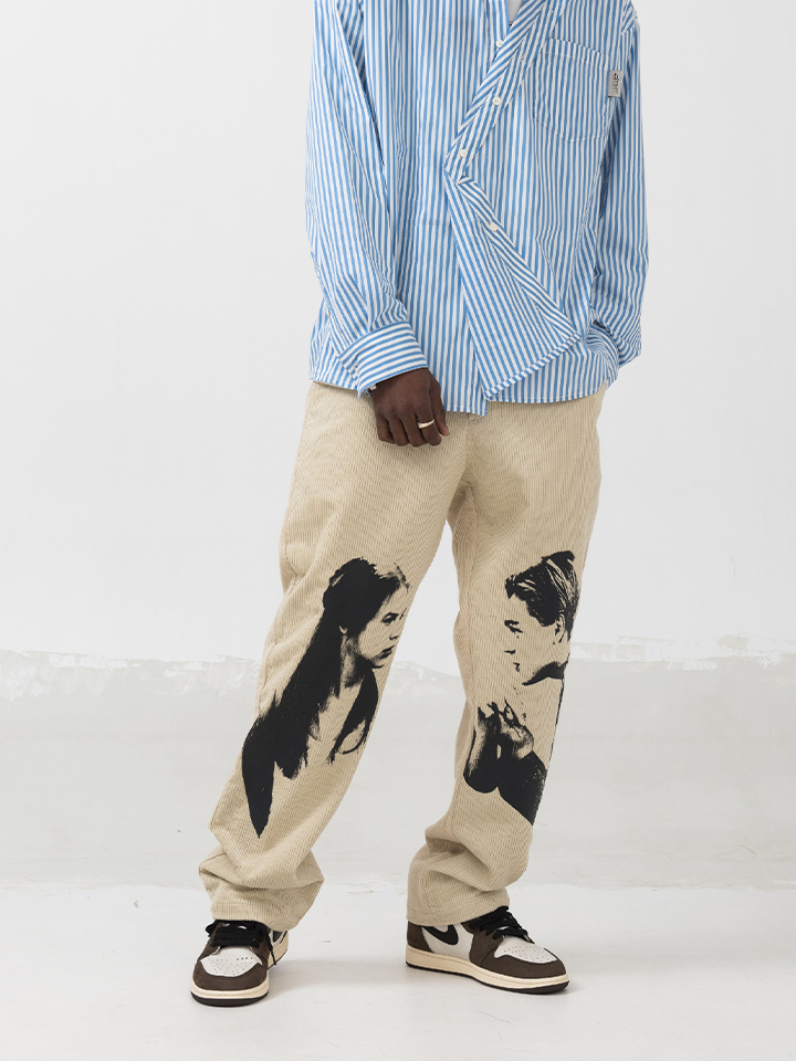 罗密欧与朱丽叶印花宽松直筒休闲裤,整体米白色,清新简约,配以黑色罗密欧与朱丽叶剪影印花点缀,更显时尚个性,整体是一种休闲时尚的风格。