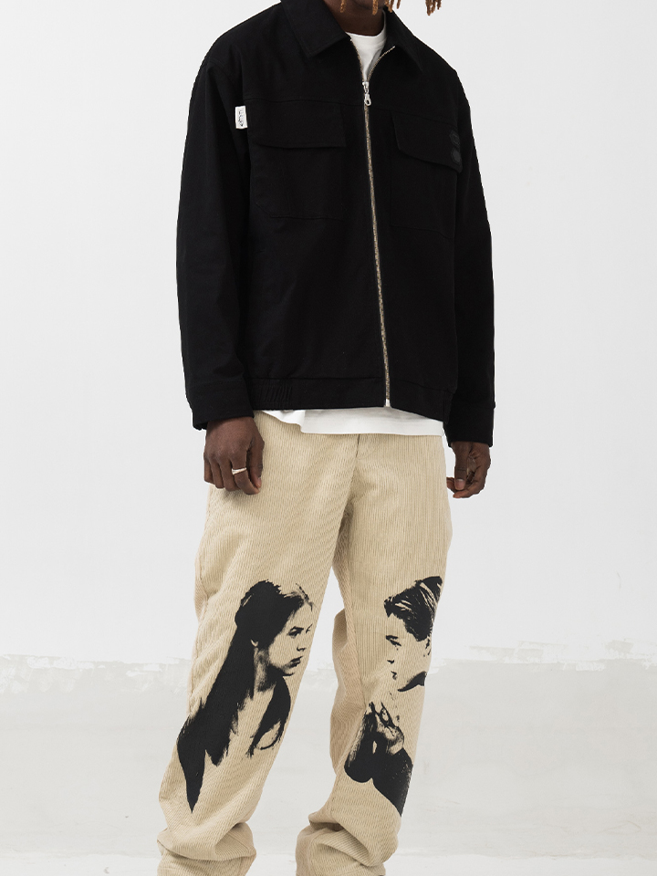 米白色罗密欧与朱丽叶印花直筒裤,本身时尚个性,因此只要简单搭配一件白色T恤和一件黑色外套,就能将休闲随性的气质完美展现。