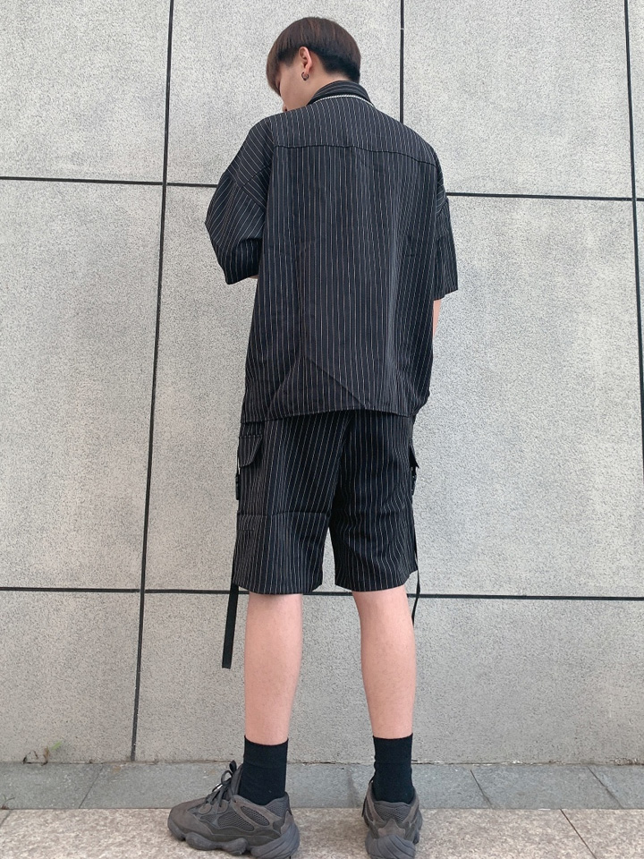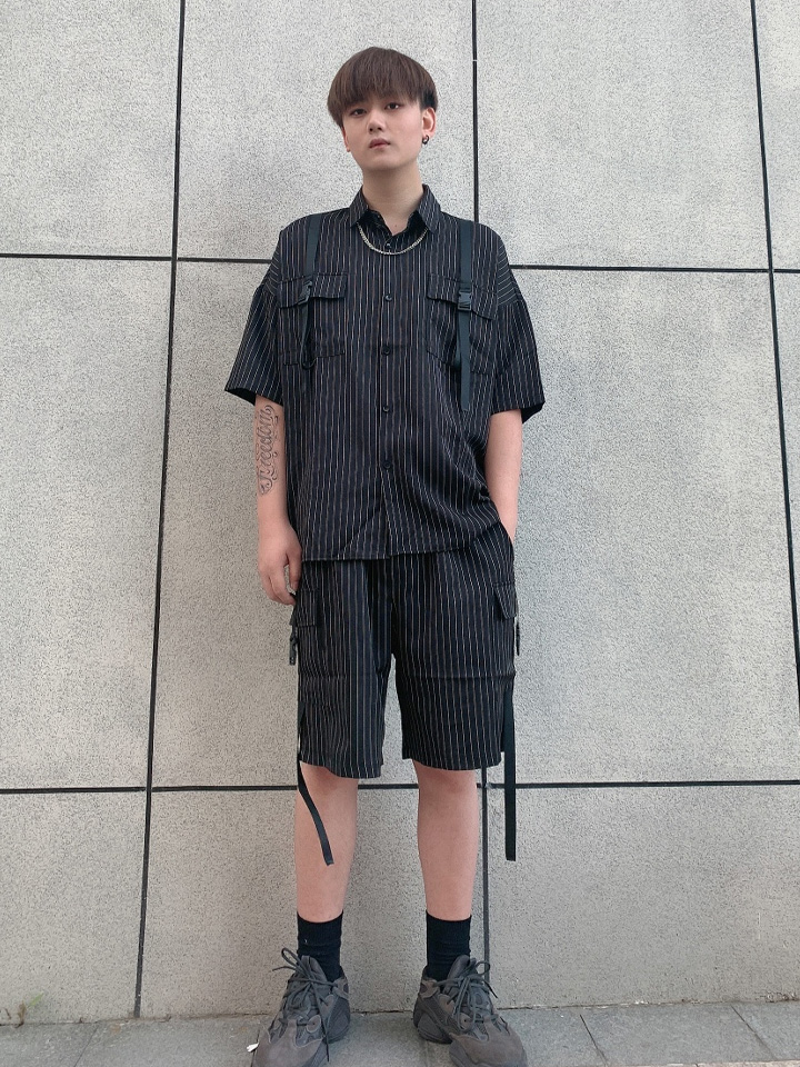 宽松的短袖衬衫和五分短裤能够很好的修饰身材,黑色竖条纹具有显瘦的视觉效果,衣服和裤子上的口袋元素突显设计感。