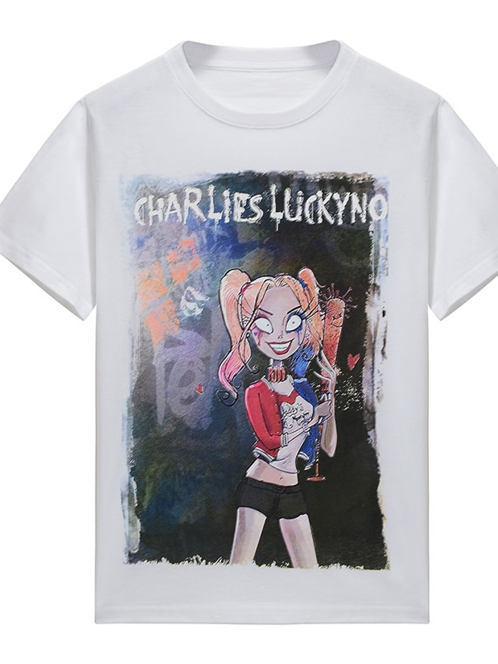 清爽的白色底色,告别夏日的闷热,带来一股清爽感。基础款的圆领短袖T恤,将自杀小队里的小丑女以印花的形式装点前幅,辅以彩色渲染,充斥着嘻哈玩味的态度。