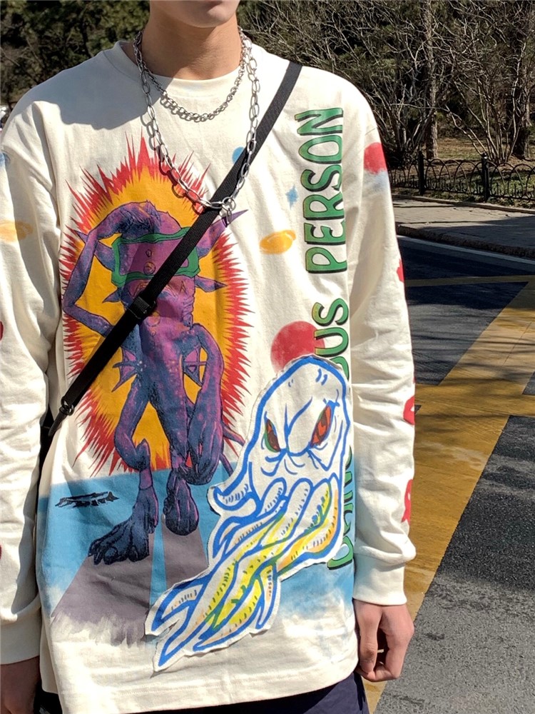 T恤的印花利用了先进的数码印花技术,它是随着计算机技术不断发展而逐渐形成的一种集机械、计算机机电子信息技术为一体的高新技术产品。具有精细、明晰、层次丰厚、自然的特性,能够印制类似于照片和绘画作风的产品。同时还有环保和节约制作成本的优势。