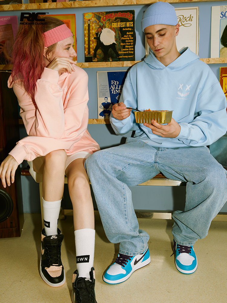 连帽卫衣的版型是经典的运动风格,配上拼色的束脚运动裤和老爹鞋就再适合不过了,清爽的蓝白系配色无论走到哪里都是吸引眼球的那一位,一双枫叶提花的袜子来点缀细节,整个造型的青春洋气呼之欲出。