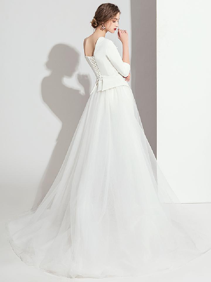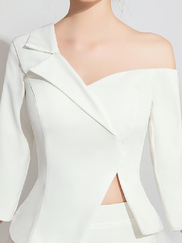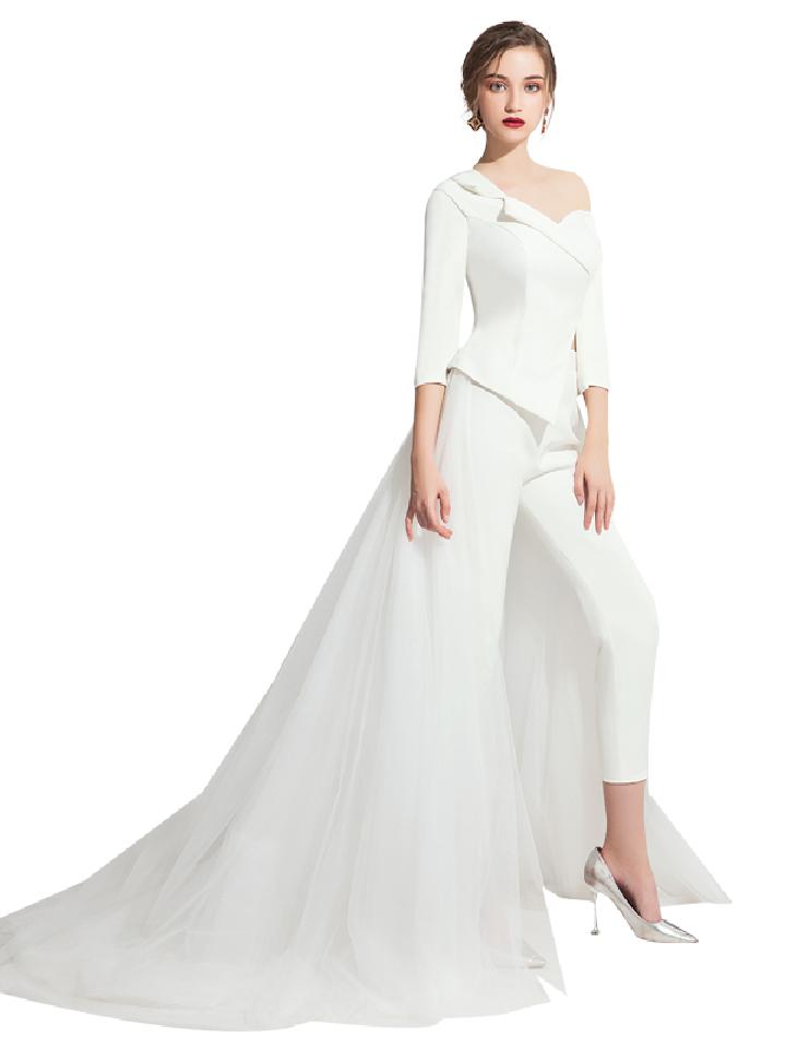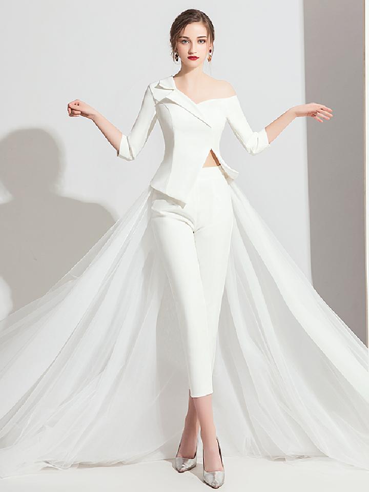 白色提花面料的小晚礼服,简约并不简陋的设计,腰部的褶皱和上部的修身,凸显女性腰身之美。背部带子和领部结合,缀满珠花更显尊贵与优雅气质。立体感十足的面料,更衬托出不凡的高贵气质。