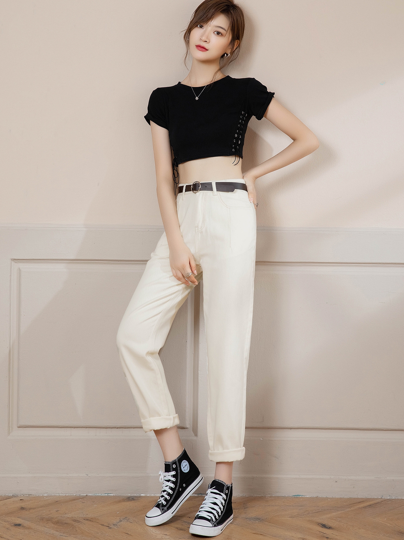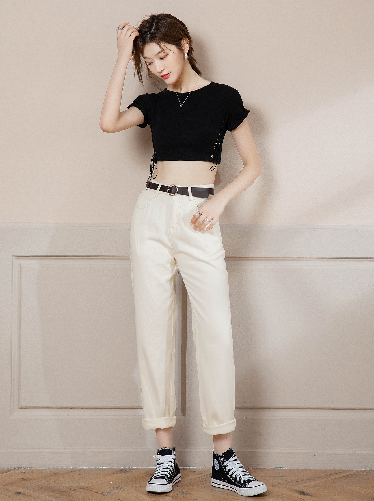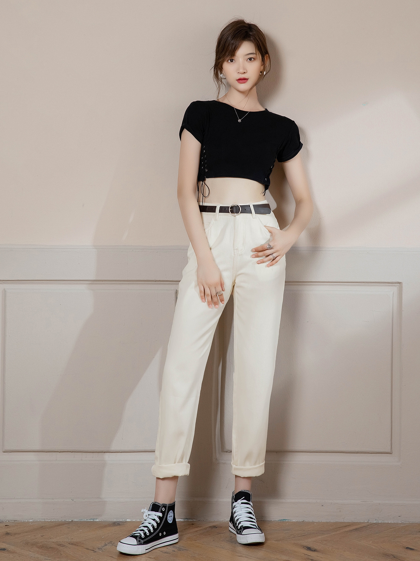 高腰的设计,拉长腿部线条,显瘦效果很好,高腰的版型,很显高挑,修身的剪裁,修饰腿部曲线,上身很有范。