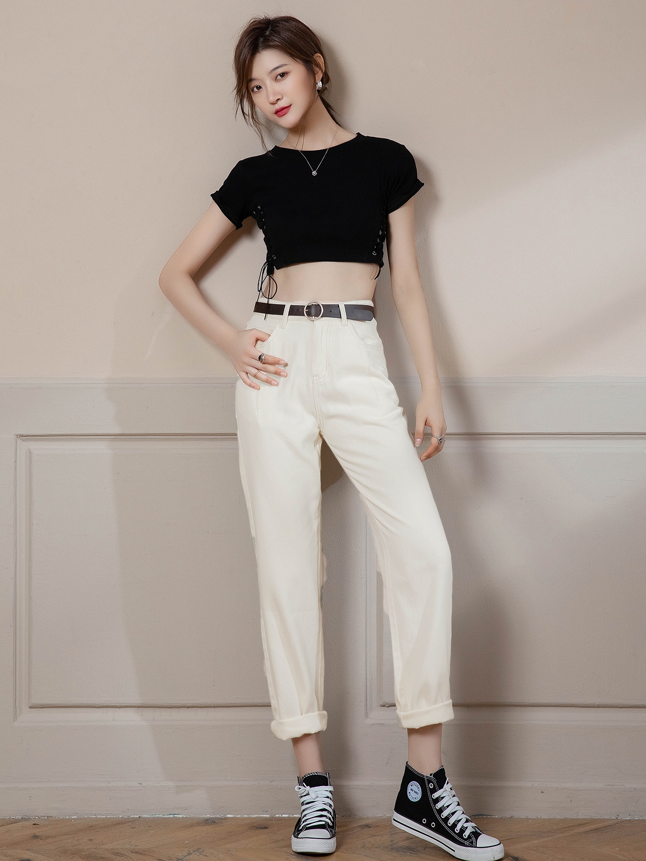 高腰设计,拉长身材比例。高腰牛仔裤,显瘦显腿长。直筒裤型,修饰腿部线条。