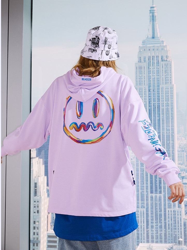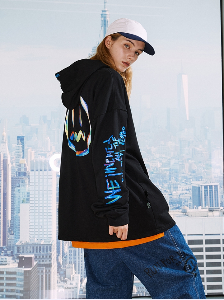 版型的剪裁宽松显瘦,上身随性自然没有拘谨感。酒红色的版面搭配袋鼠兜的设计,实用美观。小恶魔的帽子结合后背的翅膀、尾巴印花,整体打造了青春朝气的俏皮感。