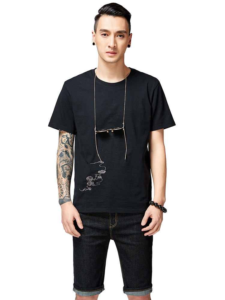 原创潮牌街派一族的短袖T恤,衣服在充满舒适随意范儿的休闲衣身上,加入前后相互呼应的充满中国传统元素的神话故事图案,营造出一丝复古民族风味道。