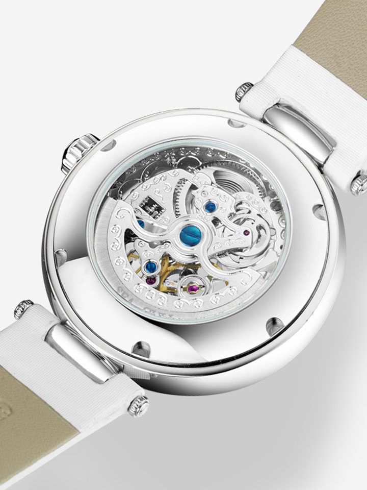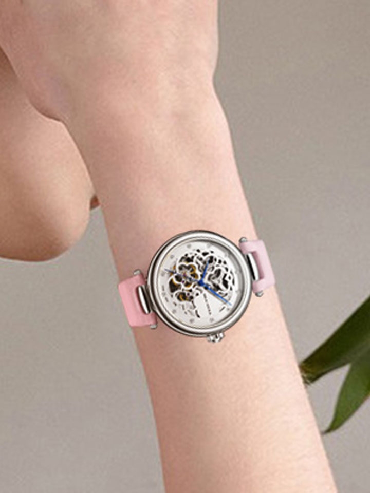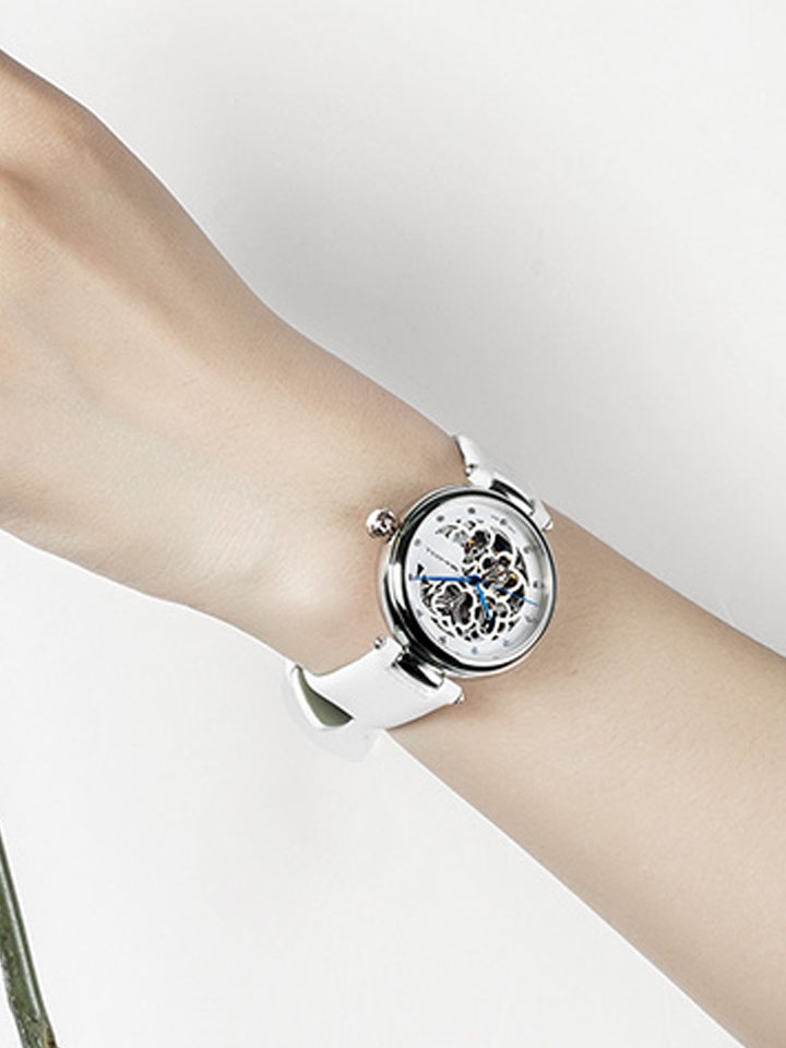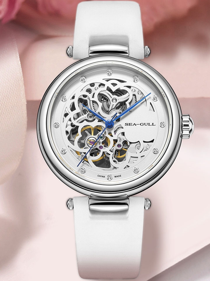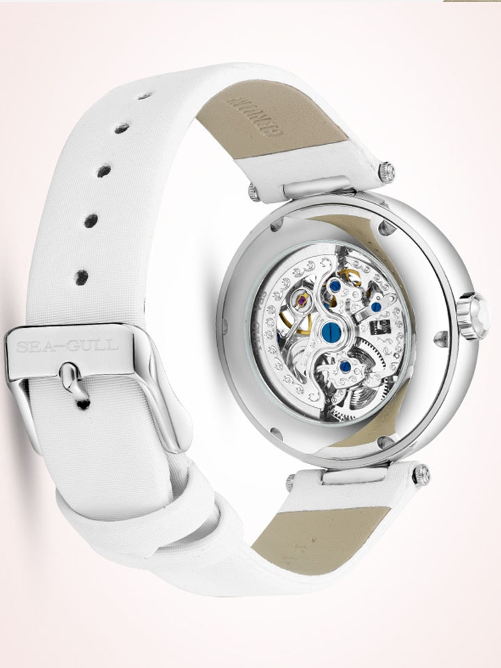 Seagull/海鸥表这款女士手表采用透视表盘设计,内部组件及机芯运动清晰可见,精湛工艺一览无余,针扣式的表扣,让腕表贴合你的腕间,使佩戴更舒适。适合追求品味,优雅气质的人群佩戴。