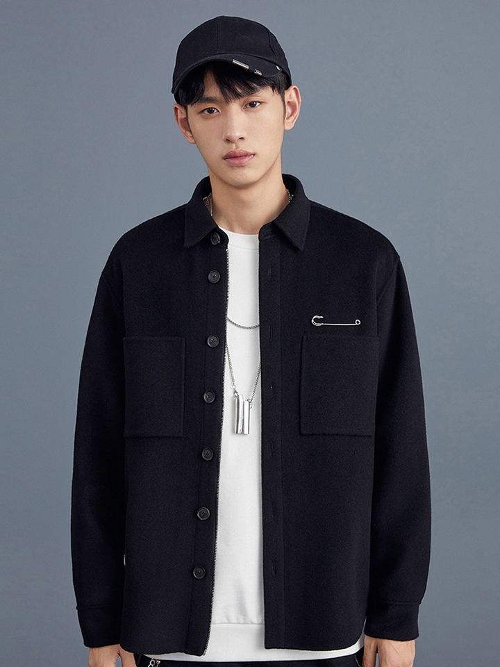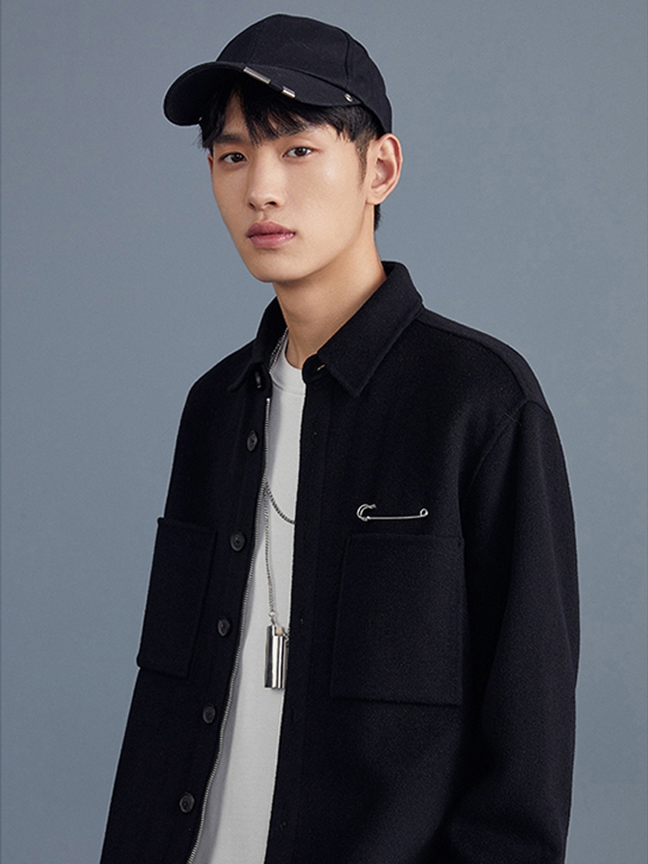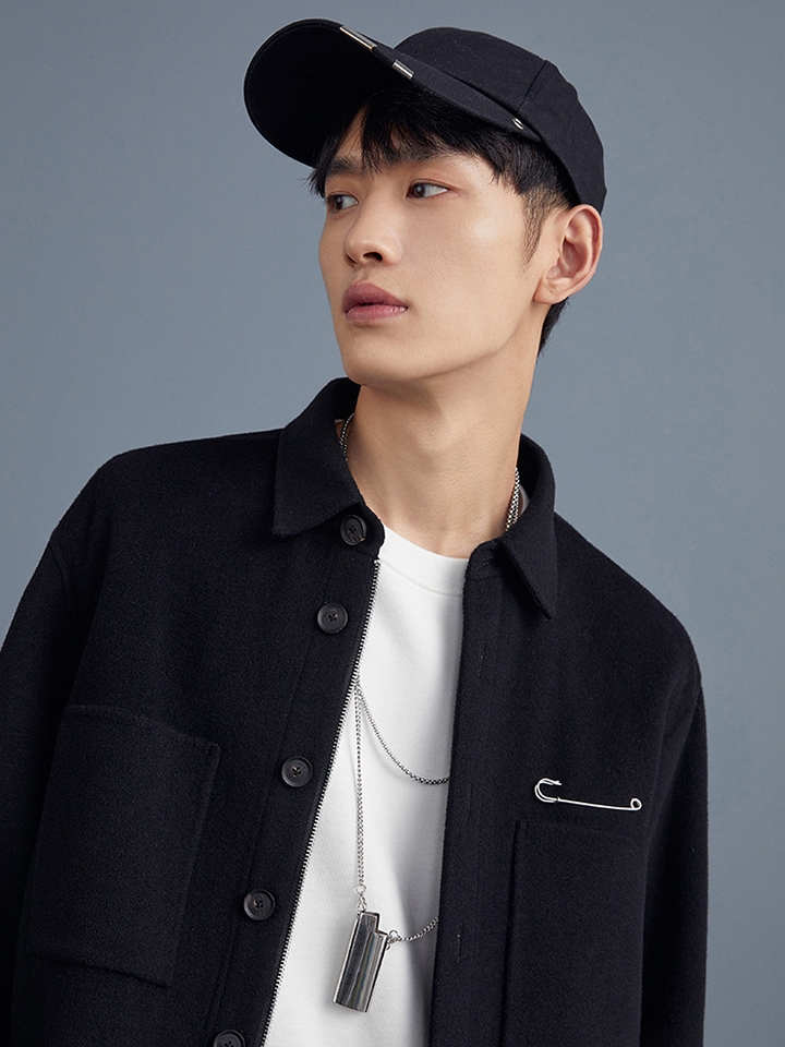 甄选美利奴羊毛,澳毛70支,黑色双面顺毛呢,从视觉到触觉都带来浓浓的暖意,外套版型剪裁得体,微微宽松的廓形,就算多塞几件进去也不会臃肿;门襟纽扣的结合装饰了半边拉链,打造潮流风向标,胸前的可拆卸别针装饰,增添整体更多元化得风格。
