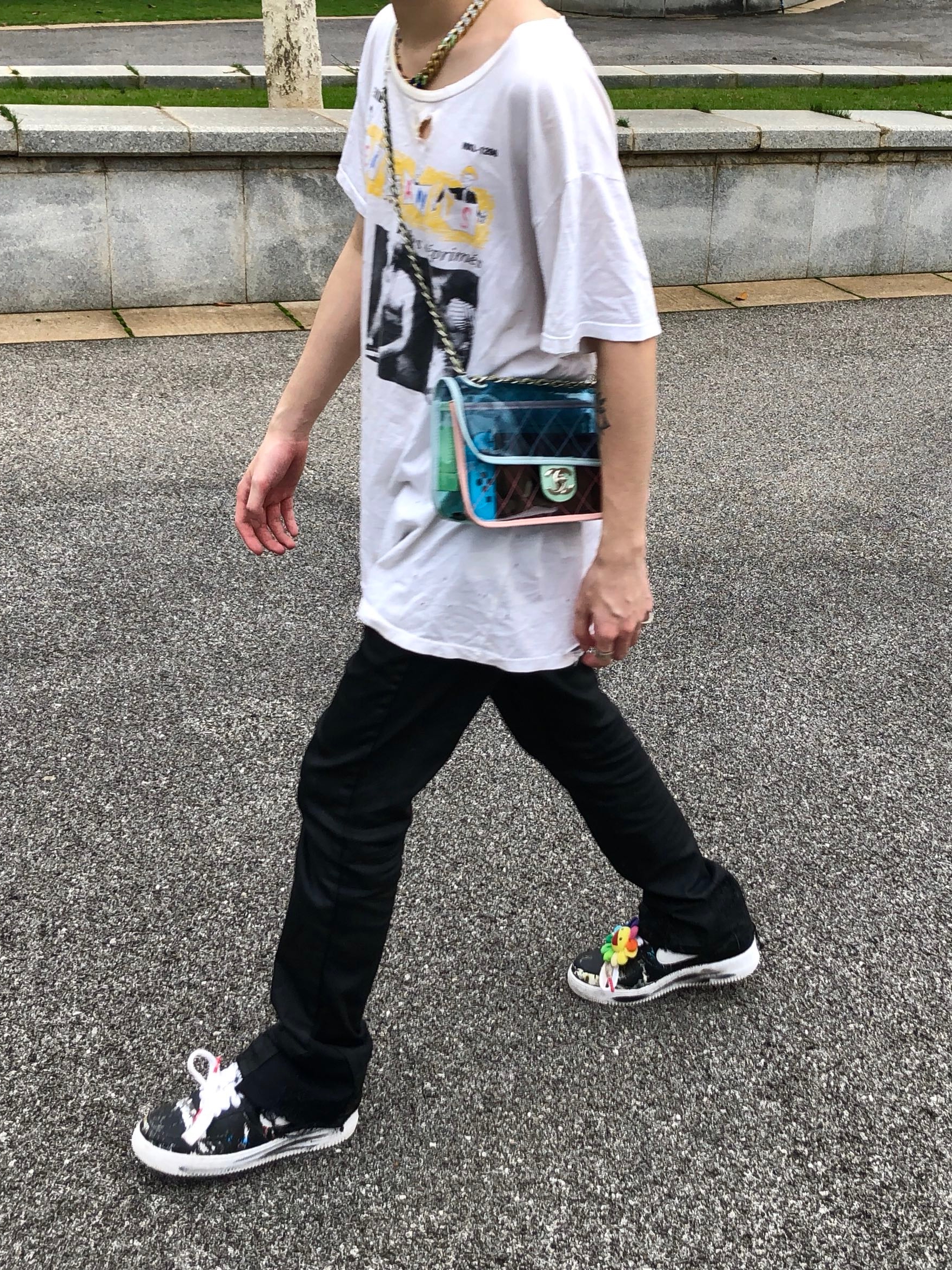 此款选用水洗做旧工艺的牛仔面料制作,裤身加入多处分割拼接设计,为裤身造型带来了更多的层次感,倍显潮流;加以破洞点缀与小面积的贴布装饰,极具层次感。