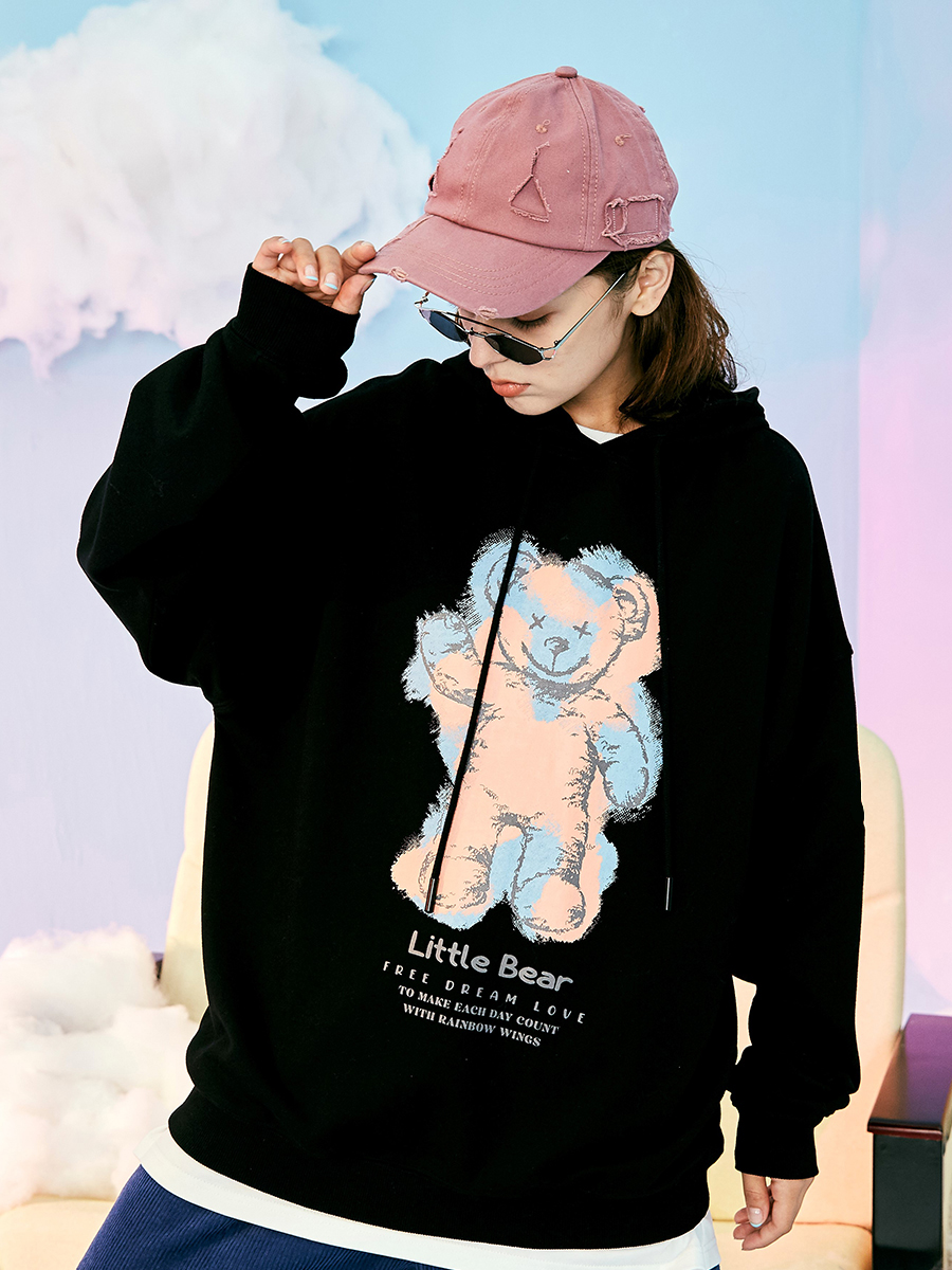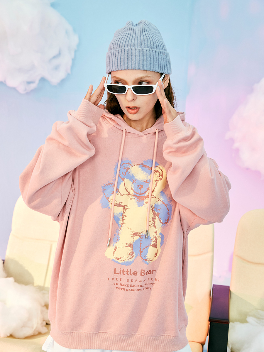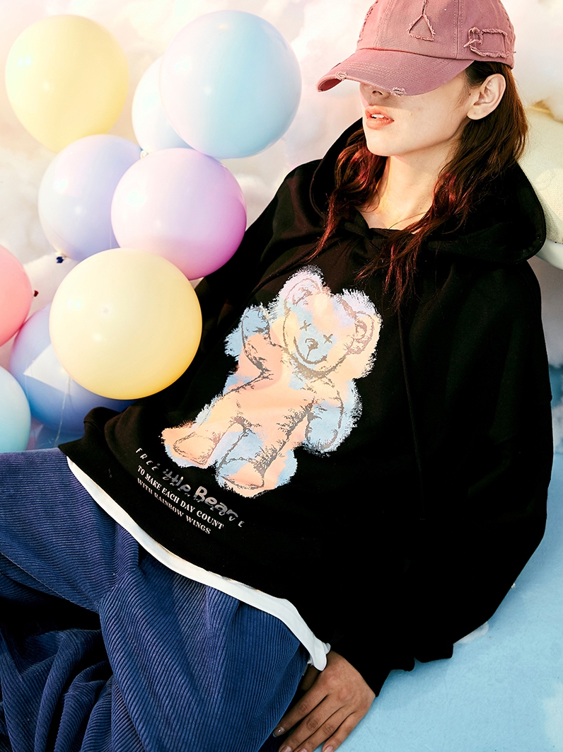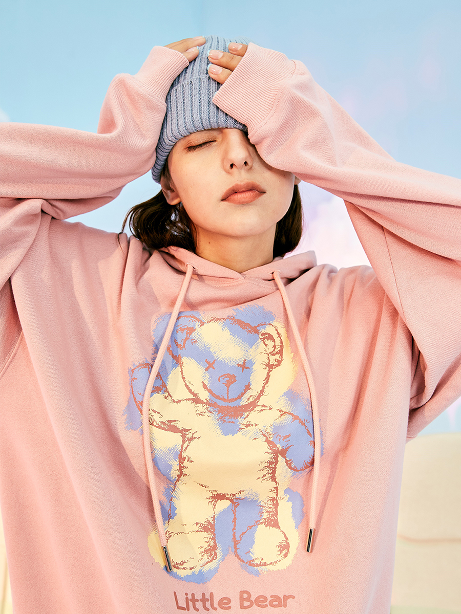 超级可爱的小熊印花卫衣,加上连帽的设计,整个人都好萌,清新的颜色,瞬间赶走了冬日的沉闷感。