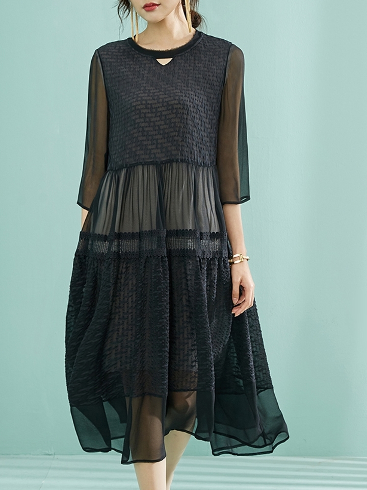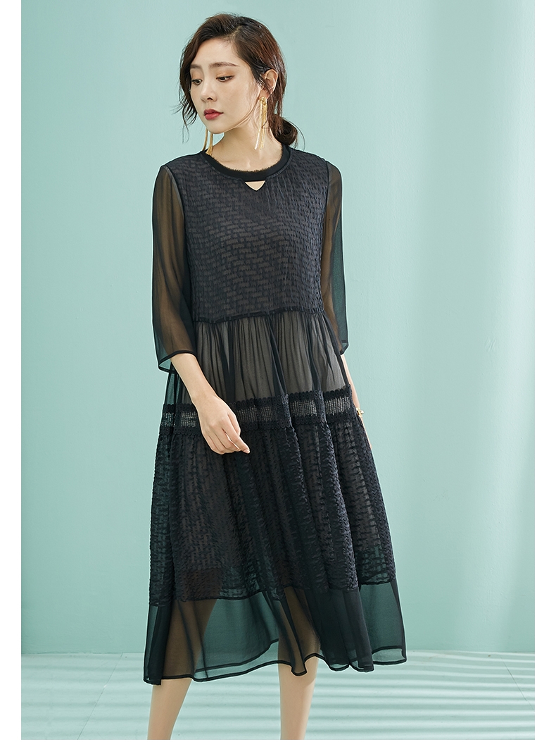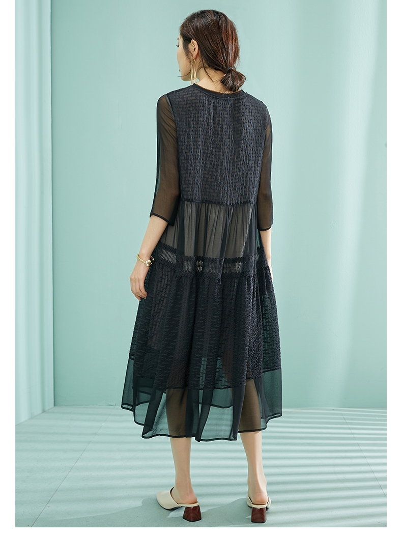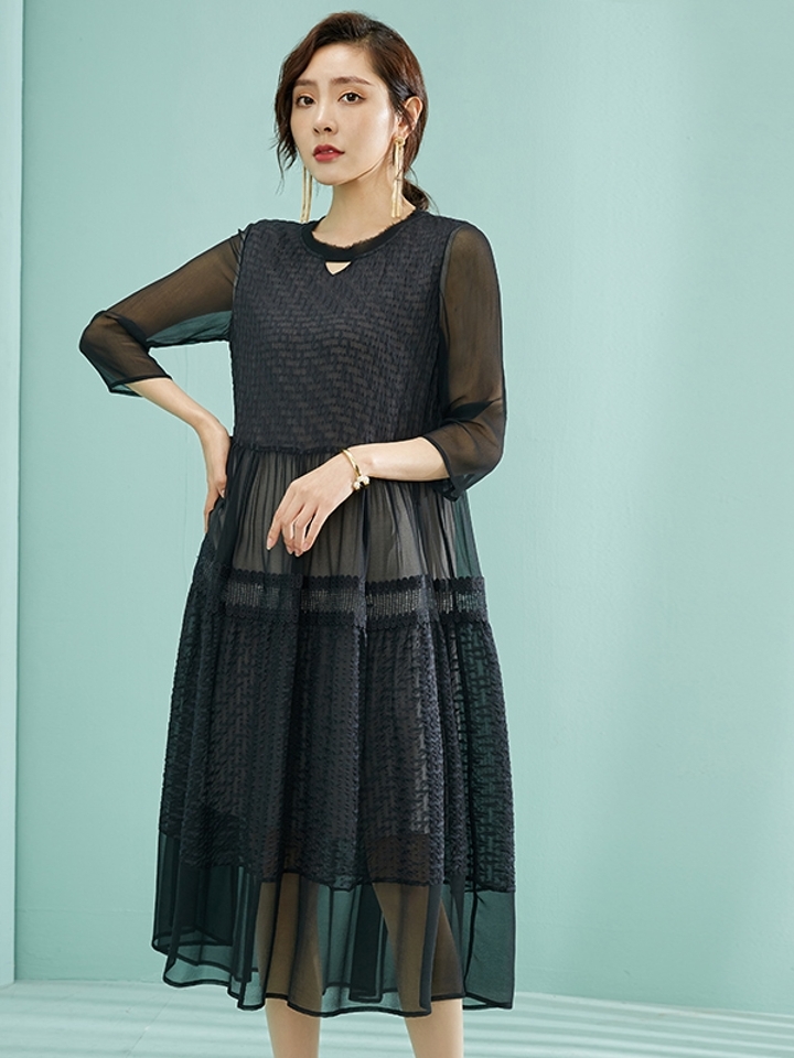 真丝的独特,从古至今都让人迷恋,不仅是清爽更利于身心,运用真丝的拼接,让我们的经典长裙也变得有了独特的韵味。