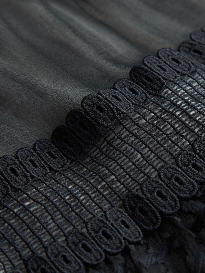 透肤七分袖修饰手臂纤细美感,披肩设计优雅灵动,修身收腰的版型勾勒出娉婷优美的身姿,褶皱自然的裙摆显得飘逸浪漫。