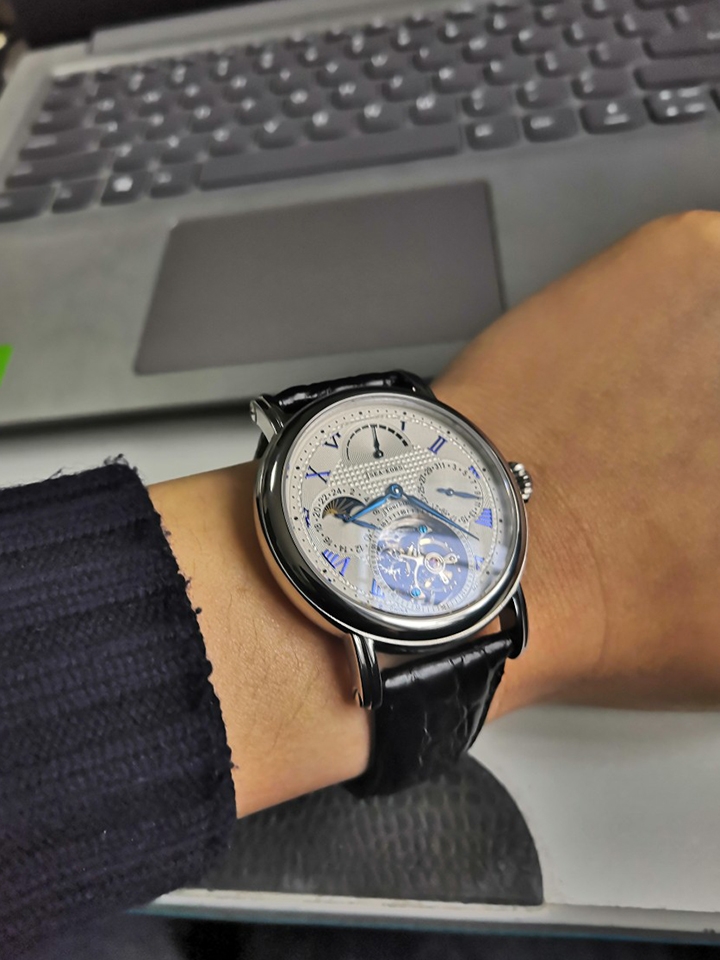 此款手表属于限量版陀飞轮,表盘属于陨石表盘。搭配鳄鱼表带,更显高端。