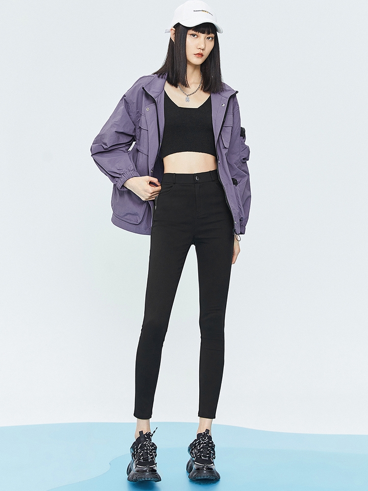 高腰的设计,拉长腿部线条,显瘦效果很好,高腰的版型,很显高挑,修身的剪裁,修饰腿部曲线,上身很有范。