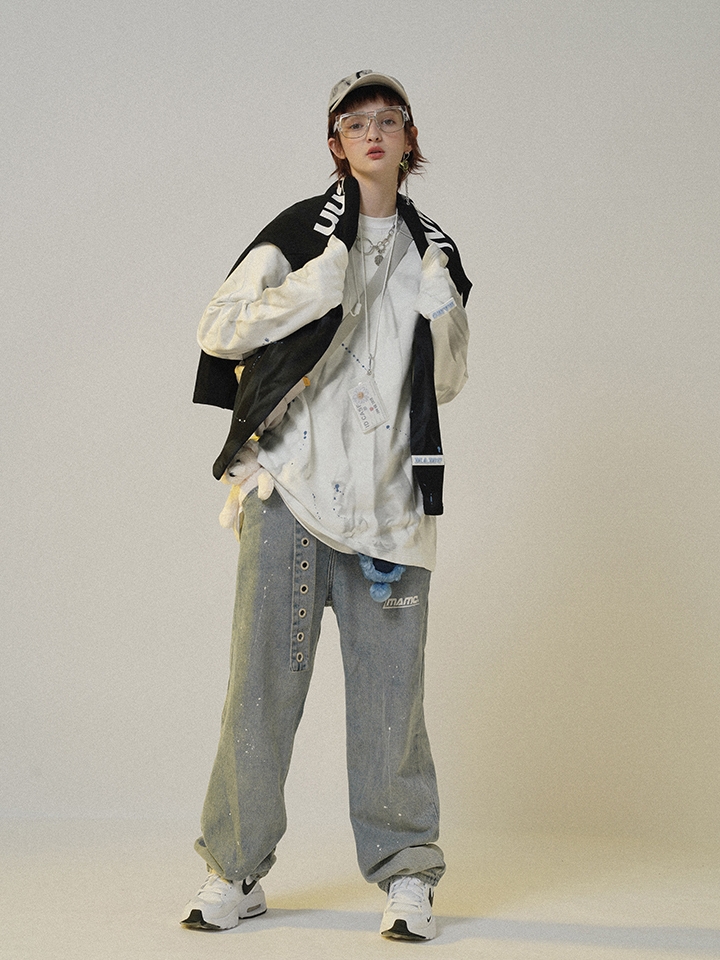 宽松的版型裁剪,包容性强,衣身还加入了泼墨漆点图案点缀,上身更具独特性。胸口与后幅都加入了品牌logo印花图案,辨识度更高,随意搭配一条宽松牛仔裤就很好。