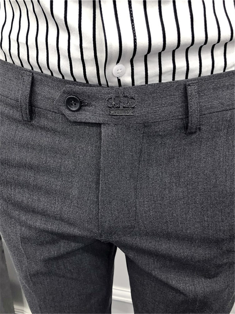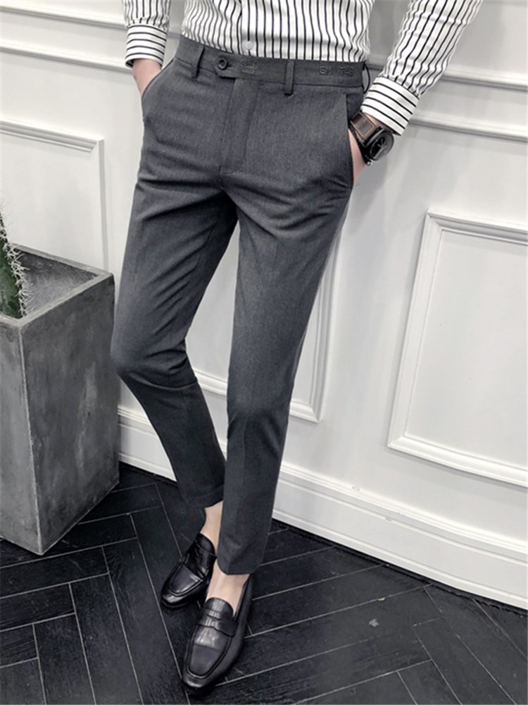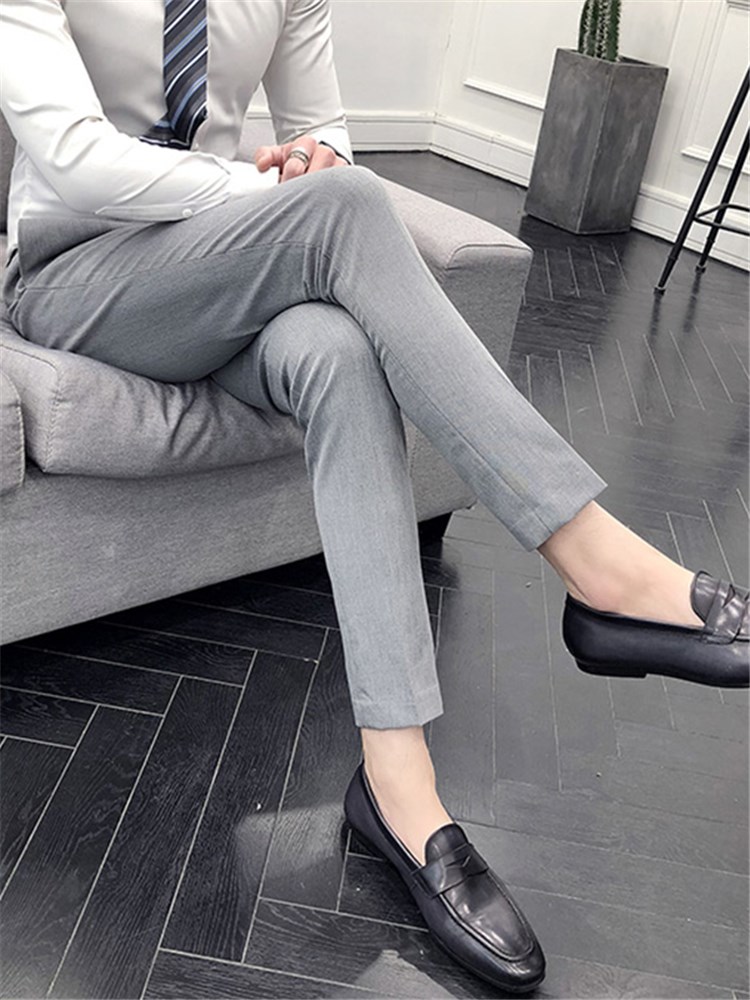 复古简约的小脚西裤,修身的版型,轮廓简约不显臃肿,线条流畅利落,高腰的版式设计使着装者显得瘦长。黑色的颜色设计,低调沉稳、简约时尚,彰显成熟稳重的男性魅力。