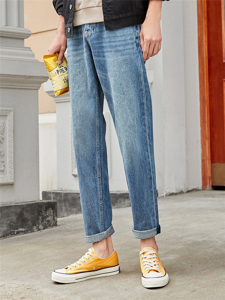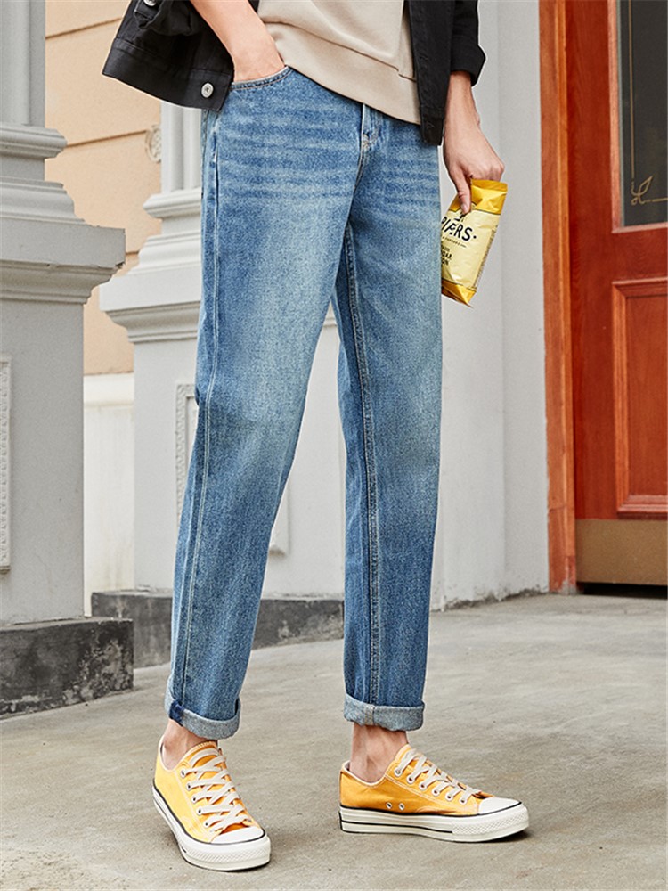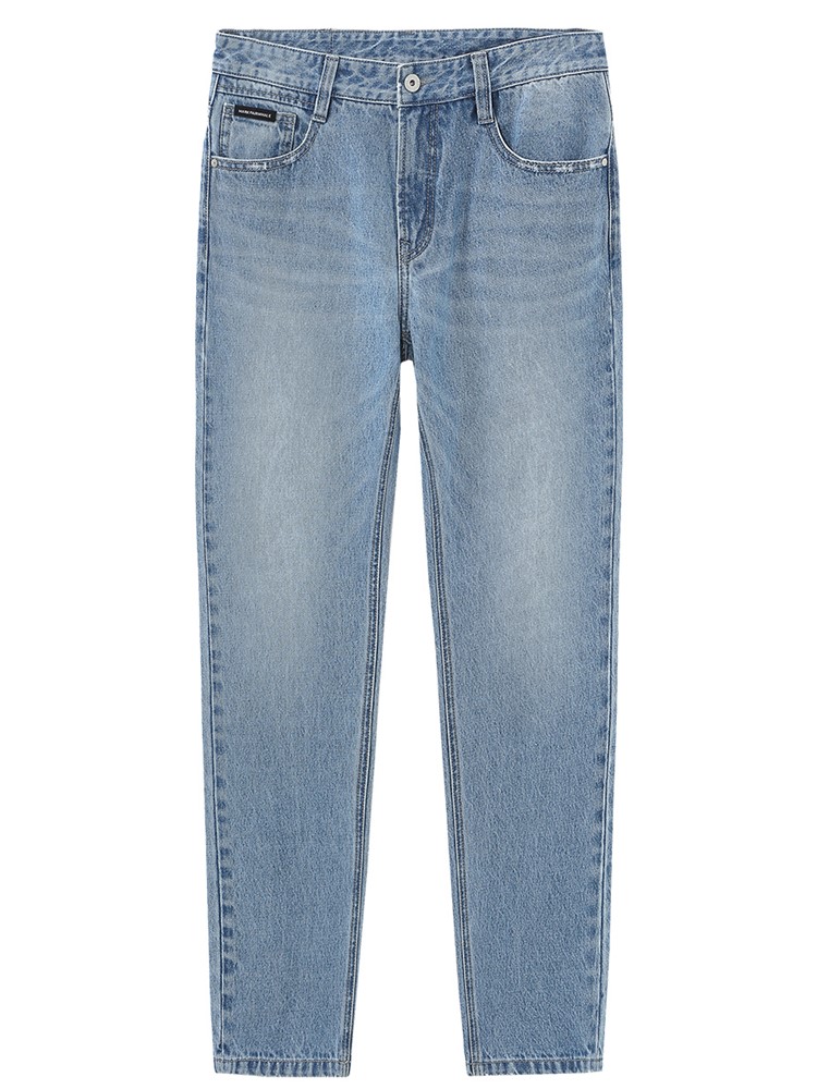 很简约基础款的一条牛仔裤,经典的水洗磨白的外形,质感有型更适合日常通勤穿着。在直筒版型的基础上采用了修身且小脚的裤脚剪裁,对腿型起到修饰作用以外,视觉上更是显瘦,小脚不仅拉长裤腿比例,还更利落,带来减龄的外形效果。