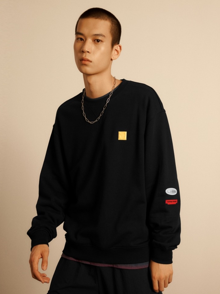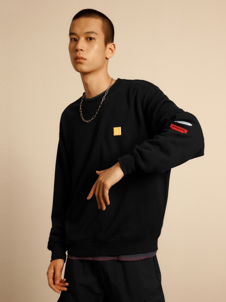 GXG圆领卫衣圆领拼接设计独特,,给人一种低调的冷酷感。衣袖的不规则拼接设计增添了层次感。袖口与衣摆的螺纹拼接设计,生动形象更适合年轻的个性潮男。整体设计宽松显瘦,酷酷的素黑色上身效果痞帅痞帅的。