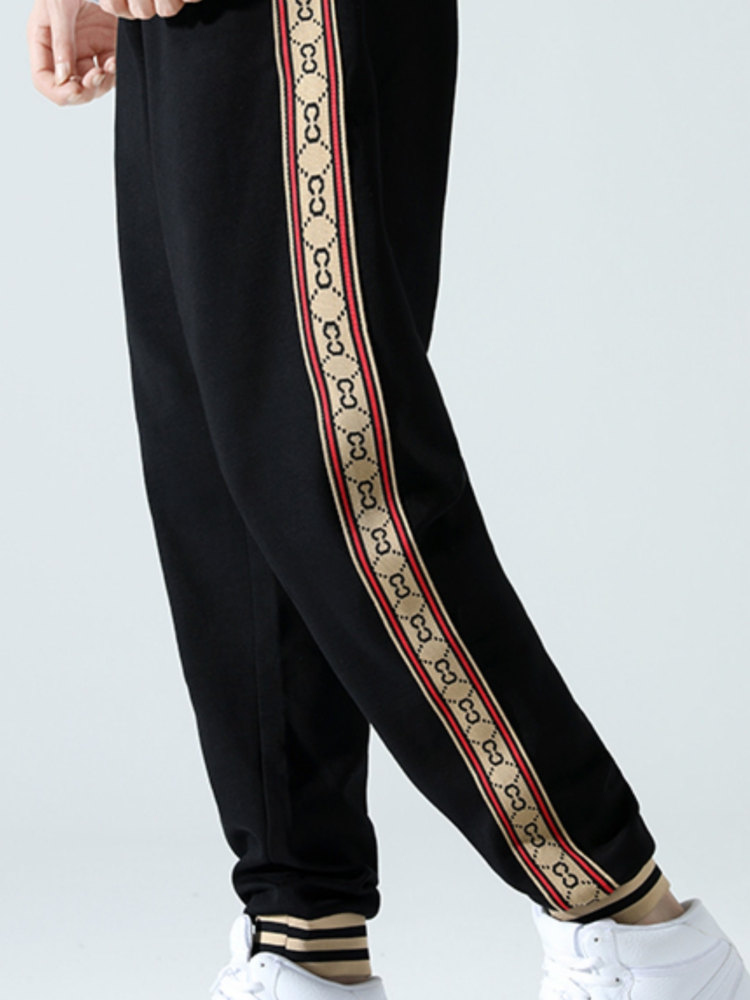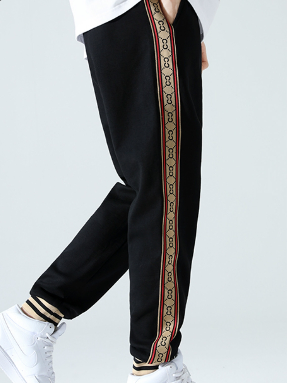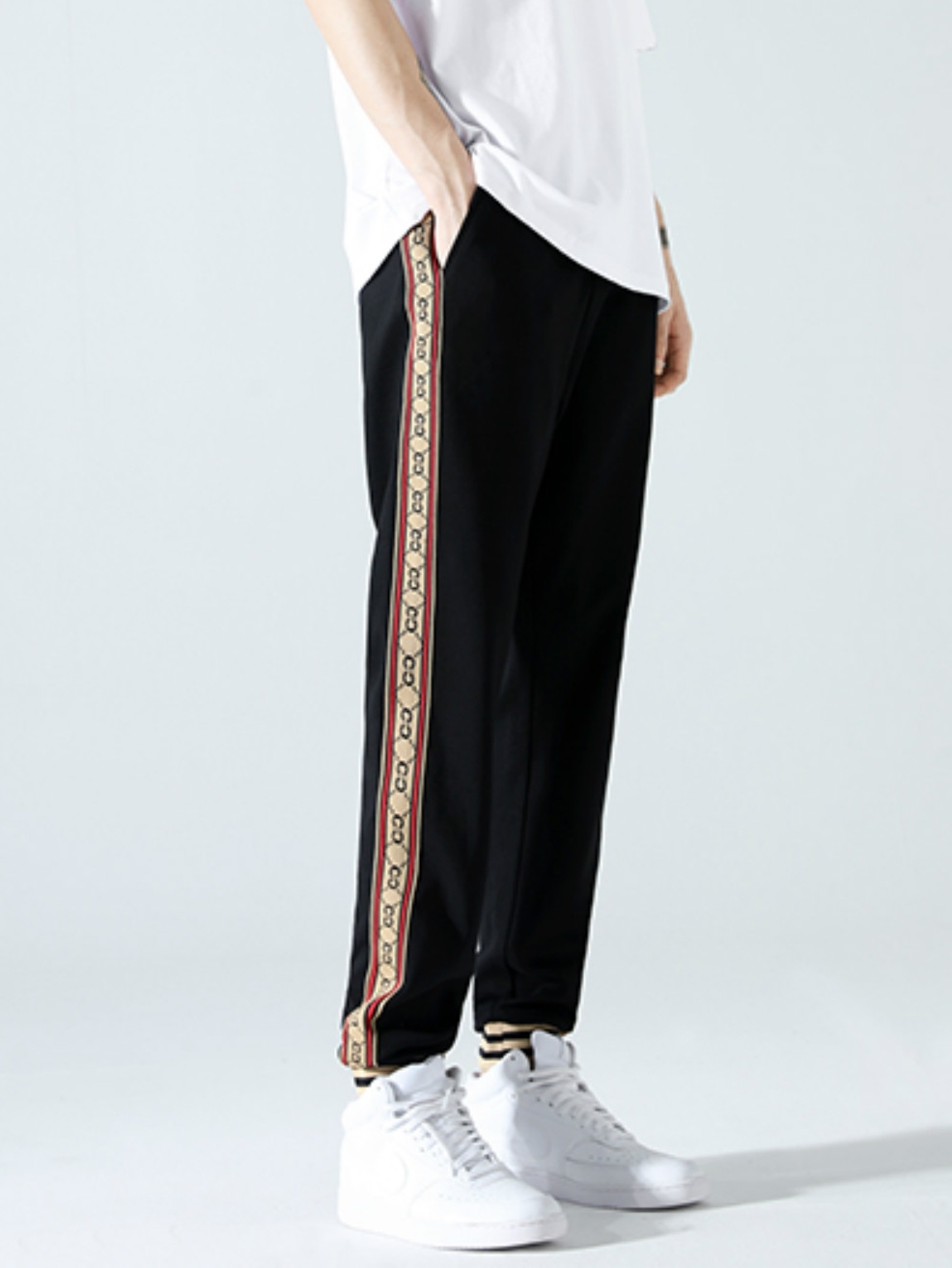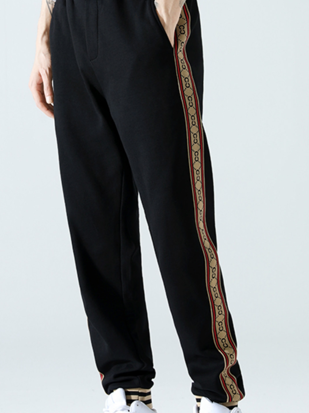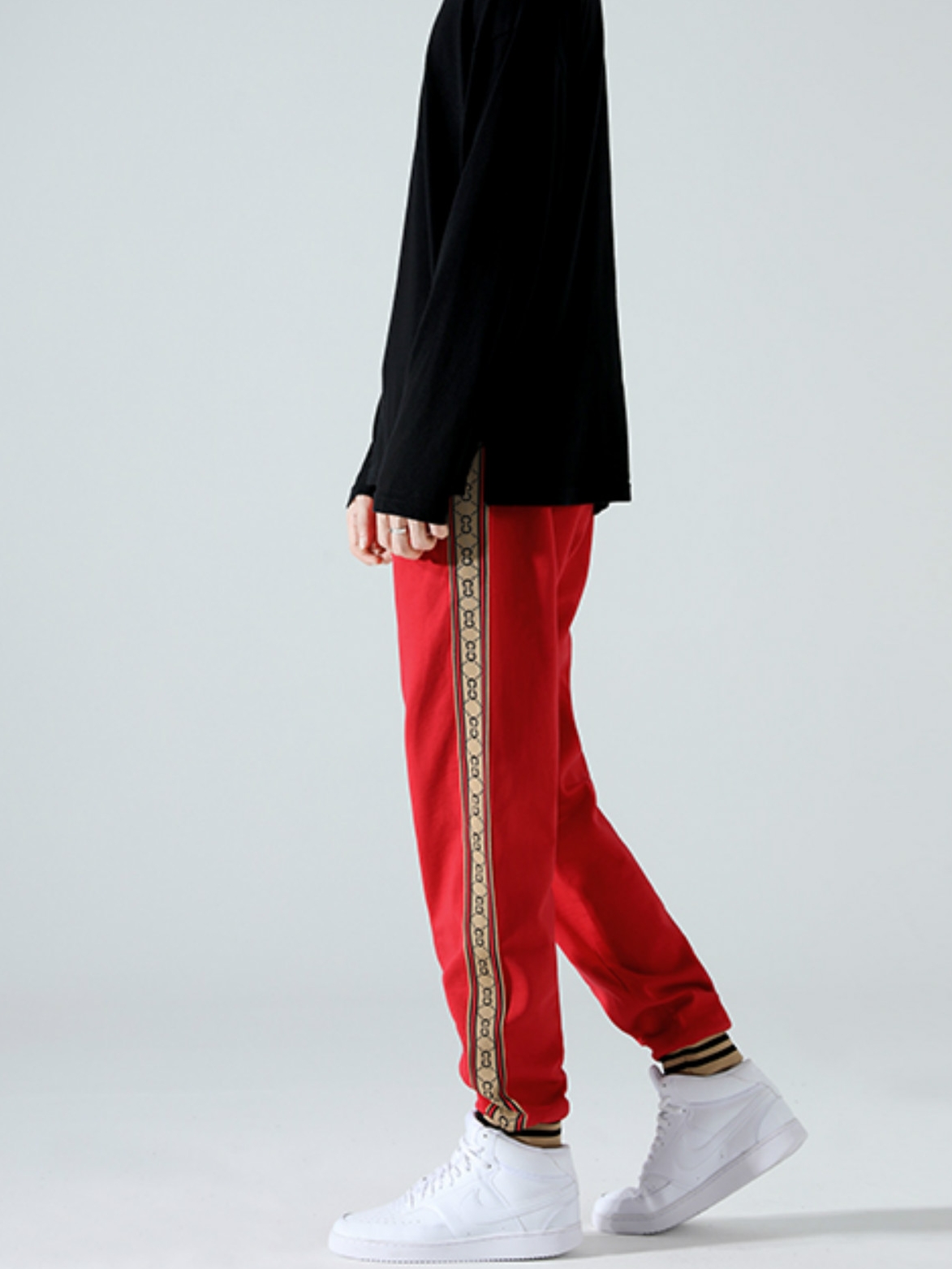 简约橡筋腰头,带抽绳设计,更显具型格魅力;拉链佩戴条纹织带,潮范十足;罗纹小脚裤设计,上身穿出魅力长腿,修身有型。裤子后部采用铆钉立体形状装饰,朋克感十足,上身有型有款。