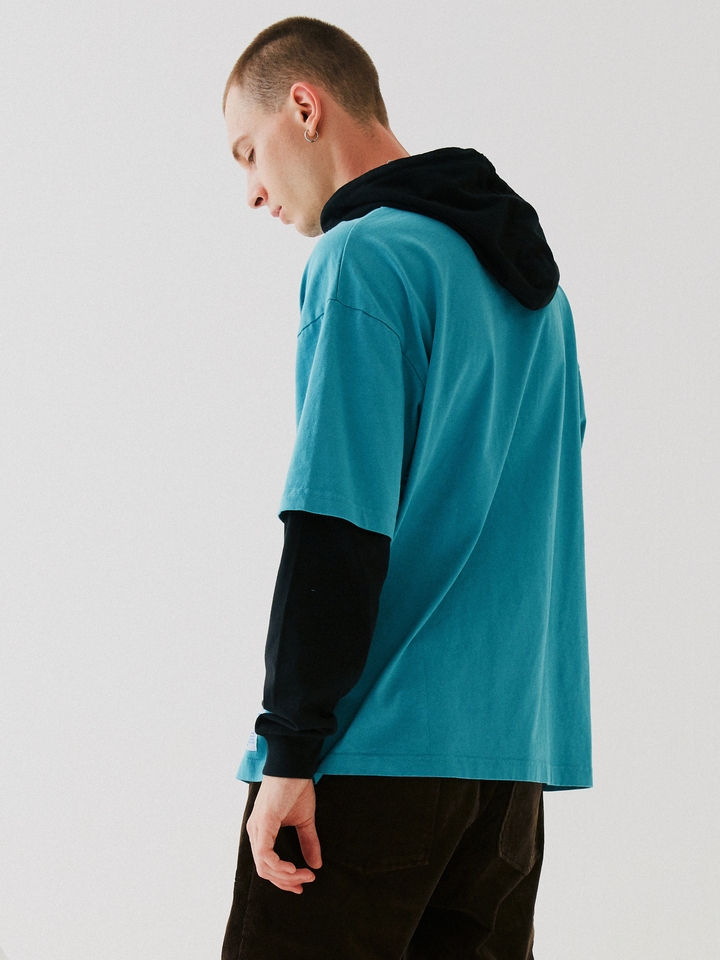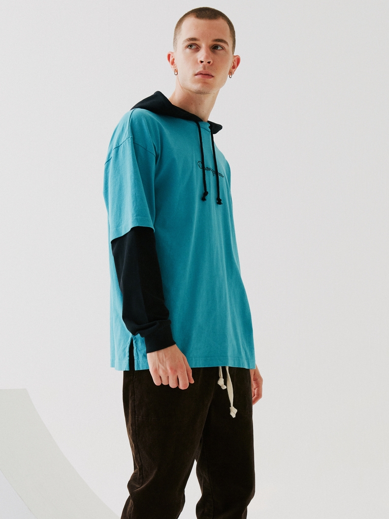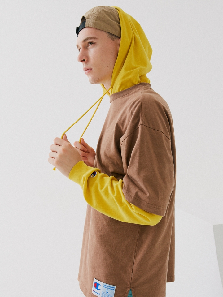 这款T恤采用时尚连帽设计,整洁利落,营造人体舒适感受,展示男士时尚酷感。撞色拼接的假两件设计,则兼具了美观与实用性。
