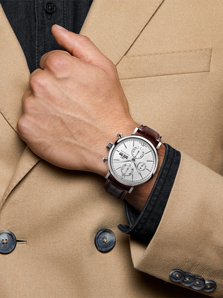 计时码表和日历功能让你满足对精确的需要,巧妙的设计使表冠与按钮仿若一体。漆黑的字面上红色秒针不紧不慢的摆动。