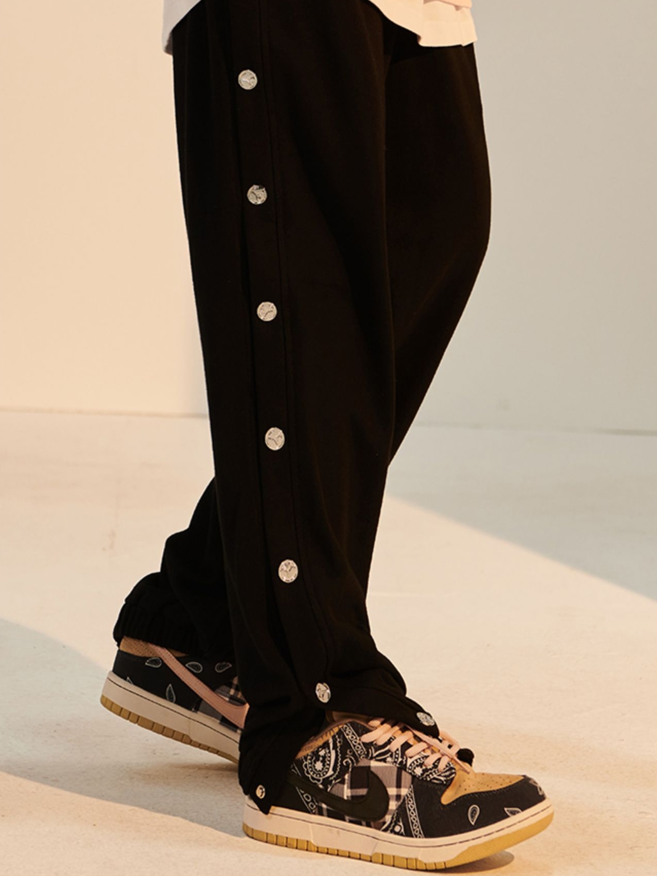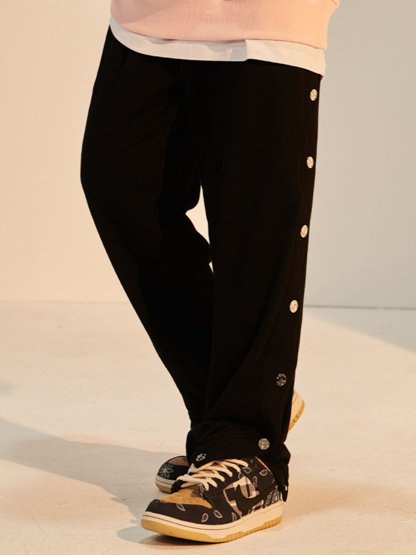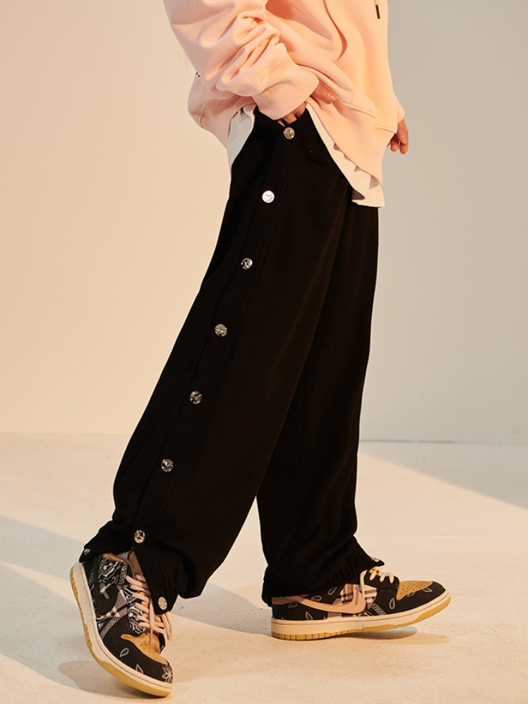 裤子的版型真的很宽松啊,带着那种hippop的感觉。而且,侧边带有铆钉点缀,更是凸显出了前卫与另类的时尚感。裤脚有收脚设计,不会拖拖拉拉的垂在地上。