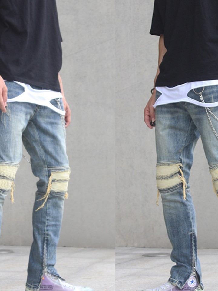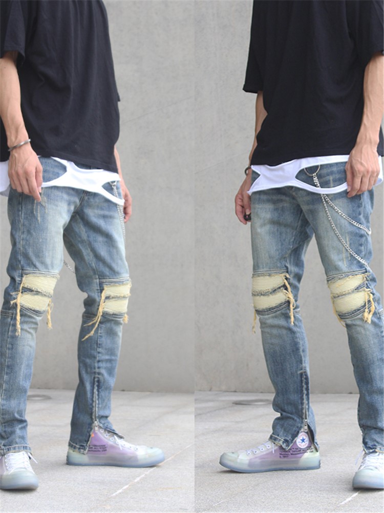 100%纯棉牛仔布面料,吸汗透气,健康亲肤;衣身的破洞设计,带来街头朋克元素,穿着帅气十足;优质金属拉链门襟,顺滑易拉,经久耐用。采用3D立体剪裁设计,符合人体工程学,贴近亚洲男士体格,修身大气,干练有型。