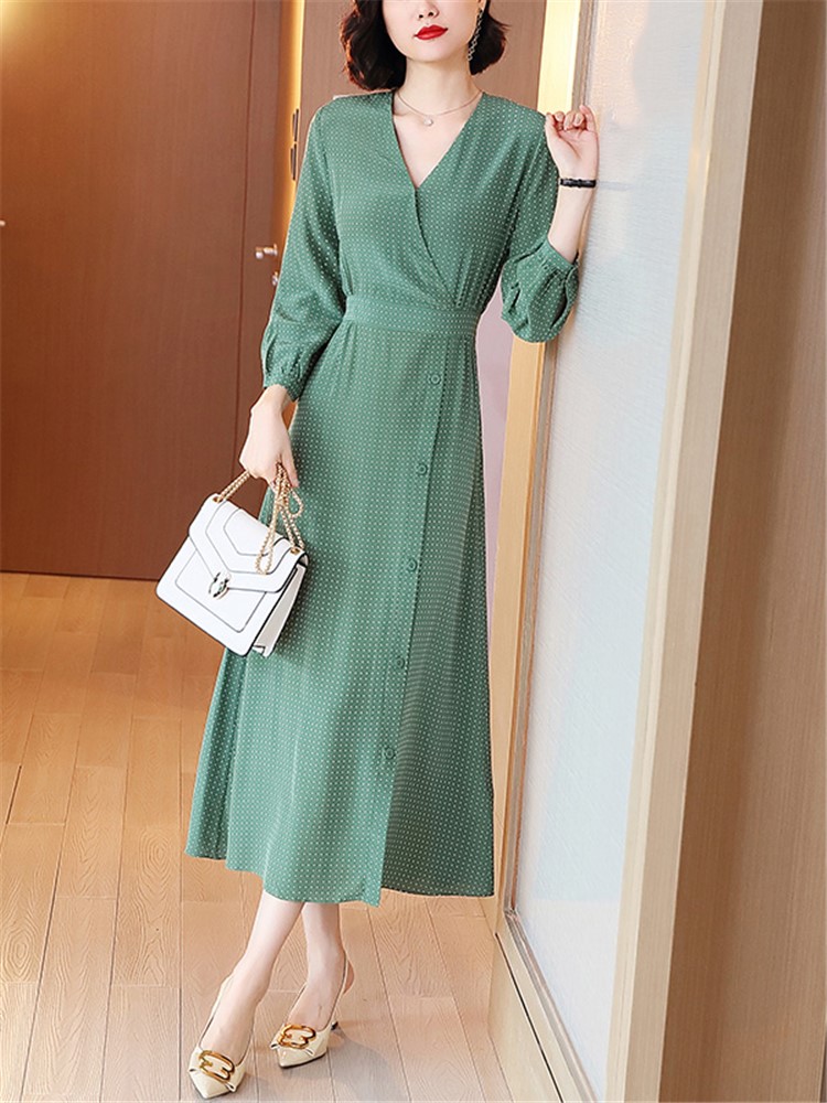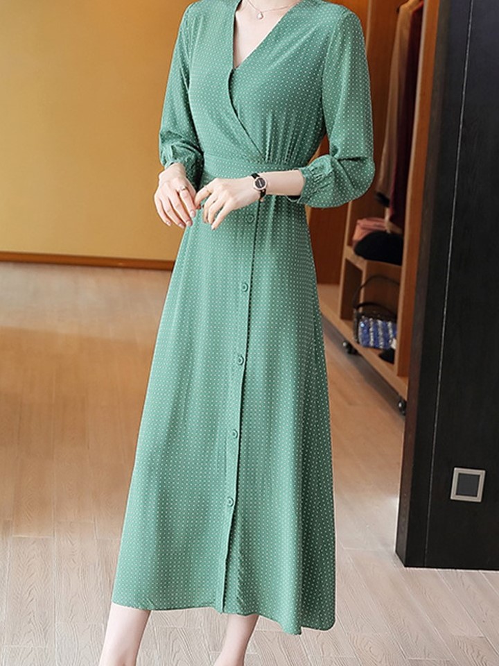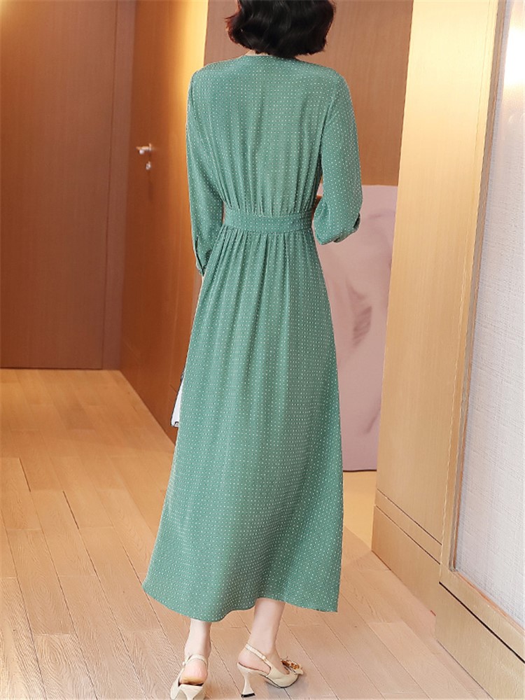 超级甜美的一款连衣裙,满满的青春少女感,大小一致的波点元素印于衣身,如同繁星般耀眼夺目,增加活泼灵动感,显得青春又减龄。挂脖的设计,显得吸睛别致,打结成蝴蝶结增添甜美俏皮感。V领的造型,大方露出性感的锁骨与颈线,散发优雅女人味儿。