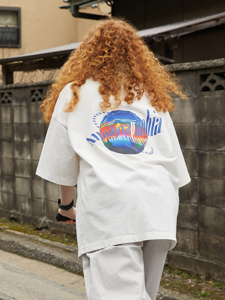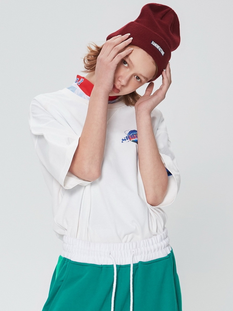 这款单品选择简洁的圆领设计,微宽松的剪裁,随性慵懒。