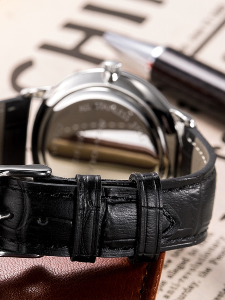 进口自动机械防水商务男表,精致打磨的316L不锈钢表圈,清晰可读的经典阿拉伯数字刻度,字面设计简洁明了,配以高级真皮表带或织网钢带,充满德国经典的理性严谨气质。