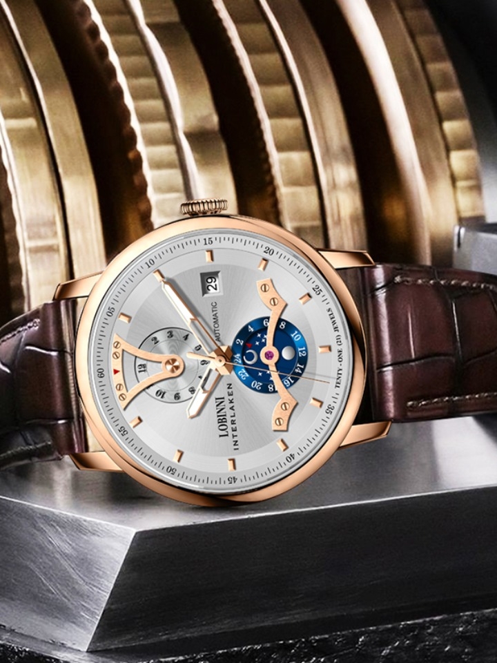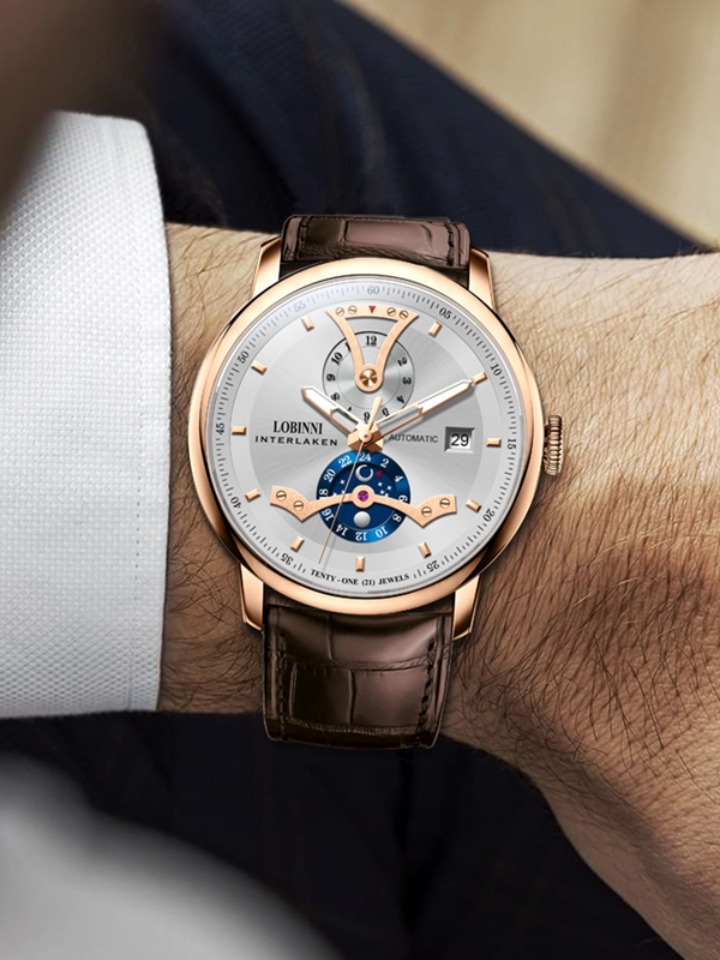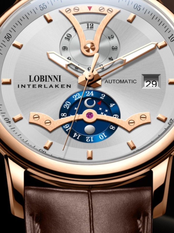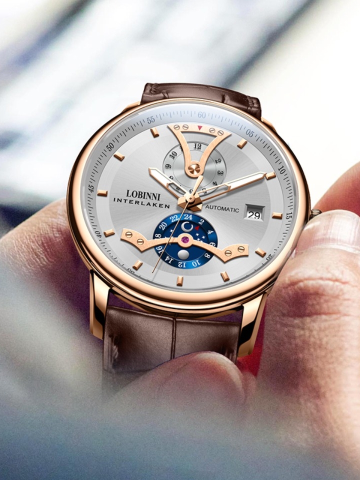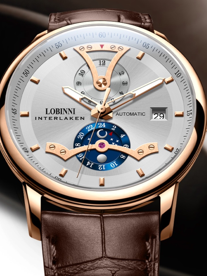 这款LOBINNI/罗宾尼腕表,经典复古风格,表壳材质为精钢,镜面材质为人工合成蓝宝石,表盘厚度为9.8mm,表盘直径为40mm,属于自动机械表,表带材质为真皮,防水深度为50m,性能卓著,时尚大气,性价比超赞。男士全自动机械表,超薄机芯独具隽永、典雅外观;搭载精湛日历、星期、月份以及日月星辰功能。布局清晰、设计新颖。