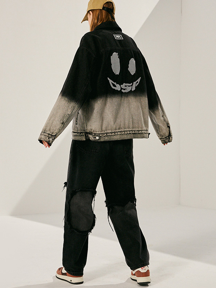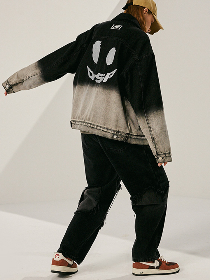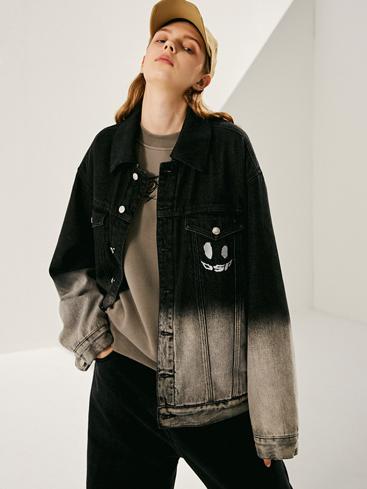 传统翻领单排扣的衣身,采用黑灰渐变的复古工艺。