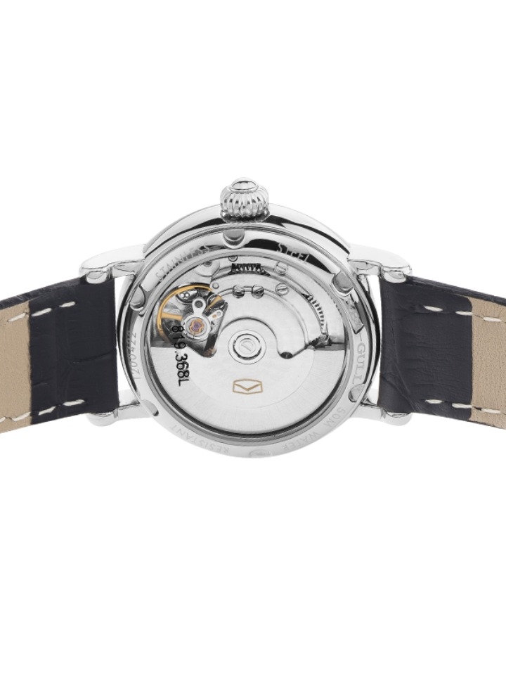 表镜与表背都采用合成蓝宝石作为表镜材质,具有较好的透光性,内部精巧的设计一览无遗;皮质表带上加入鳄鱼纹压花元素,柔软富有弹性,贴合手腕的弧度。