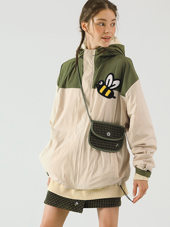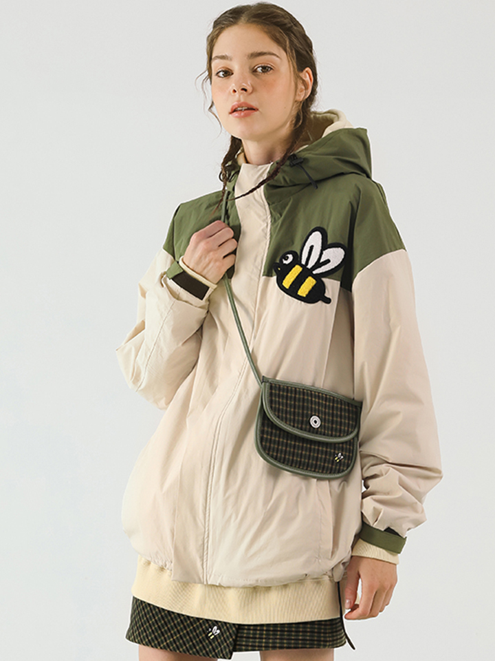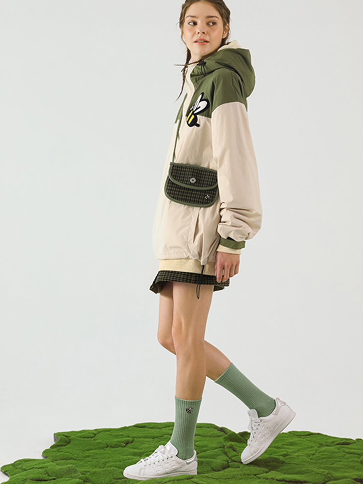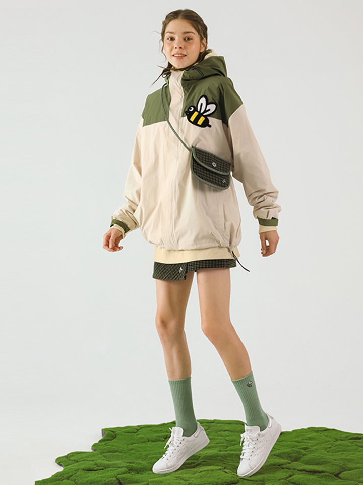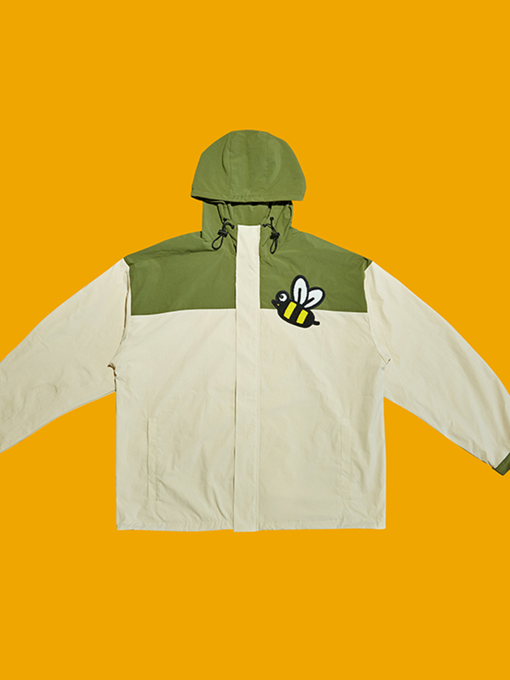 绿色的连帽抽绳设计,撞色肩部和袖口,胸前增添小蜜蜂毛巾绣。